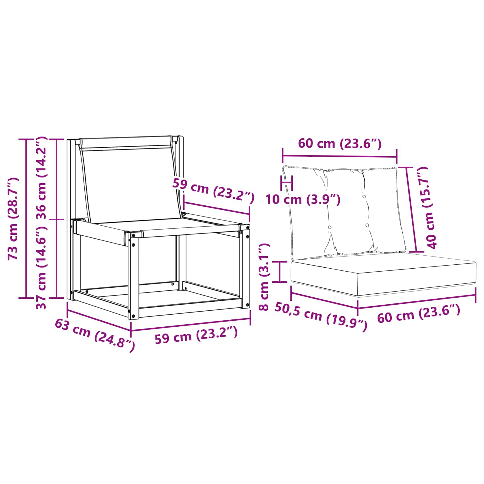 • 2 x Polštář sedáku: 60 x 50,5 x 8 cm (D x Š x V)
