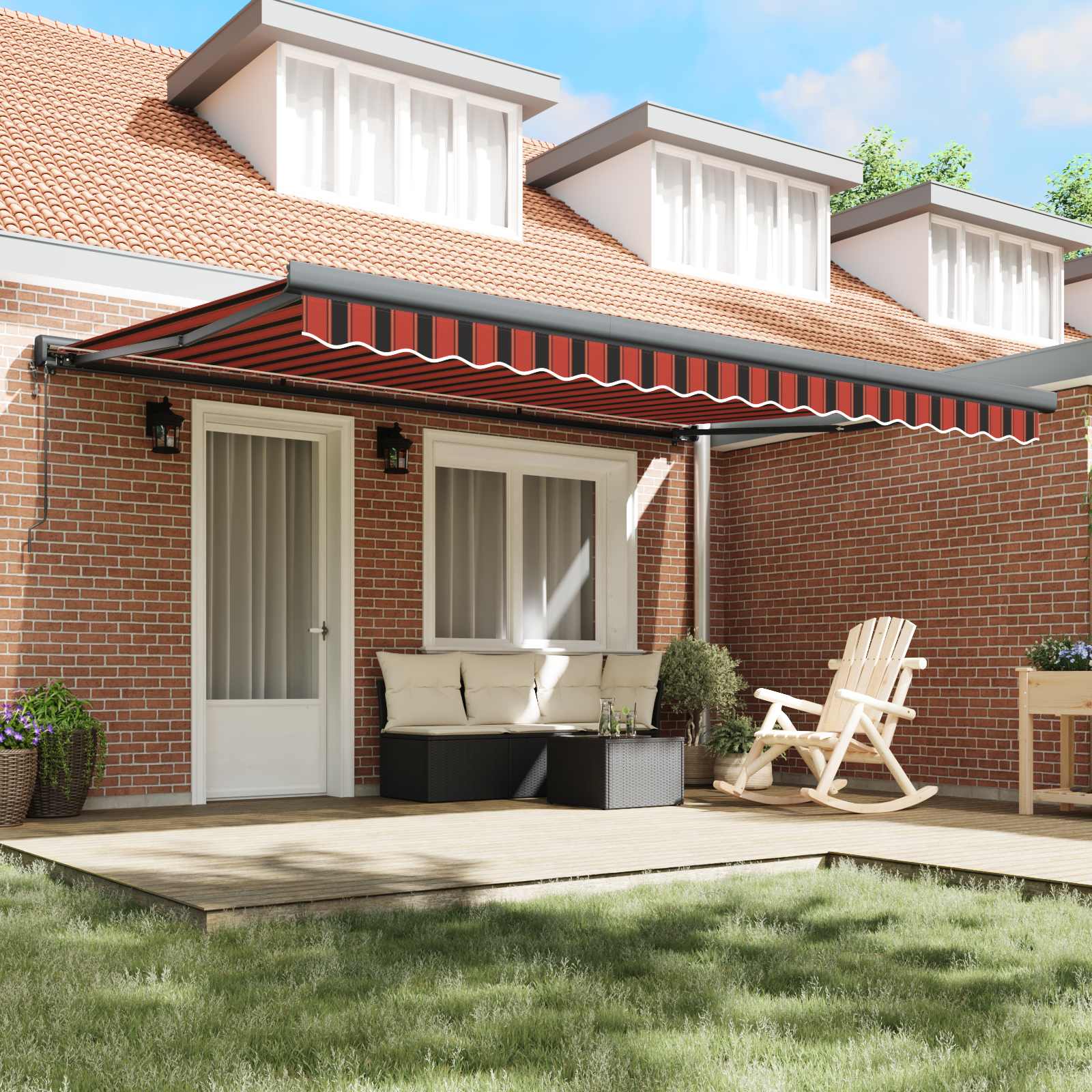 • Odolný polyester a hliník: Jak polyester, tak hliník dělají markýzu silnou a lehkou, takže vydrží i různé povětrnostní podmínky. UV-odolná látka chrání před sluncem a hliníková konstrukce snáší opotřebení - to je zárukou dlouhé životnosti bez ztráty vzhledu.