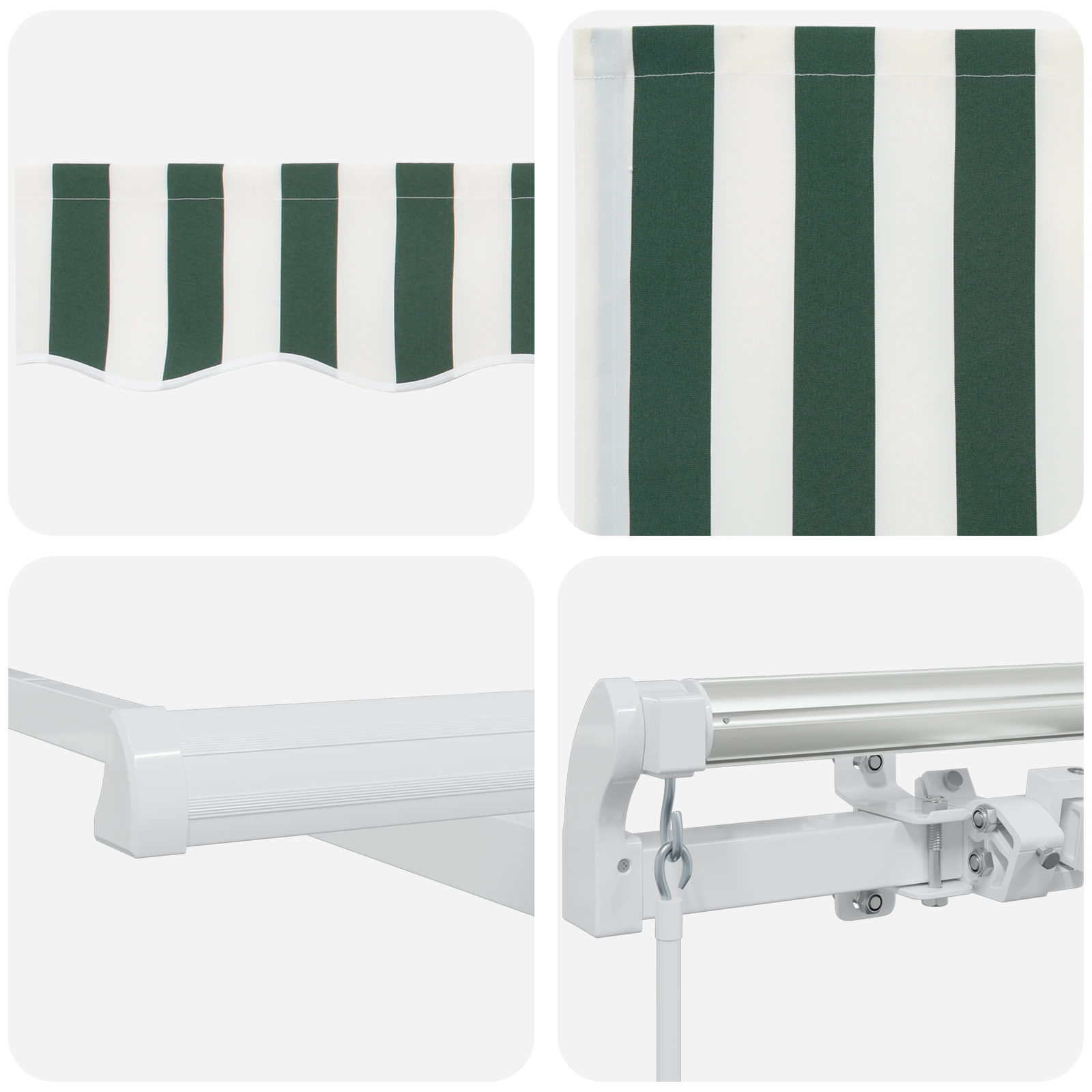 Tato výsuvná markýza je dokonalým spojením funkčnosti a stylu, skvěle se hodí do zahrady nebo na terasu. Její moderní design má čisté linie a minimální zdobení, které dobře zapadá do venkovních prostor. Ať už plánujete rodinné barbecue, nebo si užíváte kávu, tahle markýza vám poskytne stíněný úkryt, promění otevřené prostory na útulné místo. Její jasné zelené a bílé barvy rozsvítí každé místo, zatímco konstrukce je pevná a trvanlivá.
