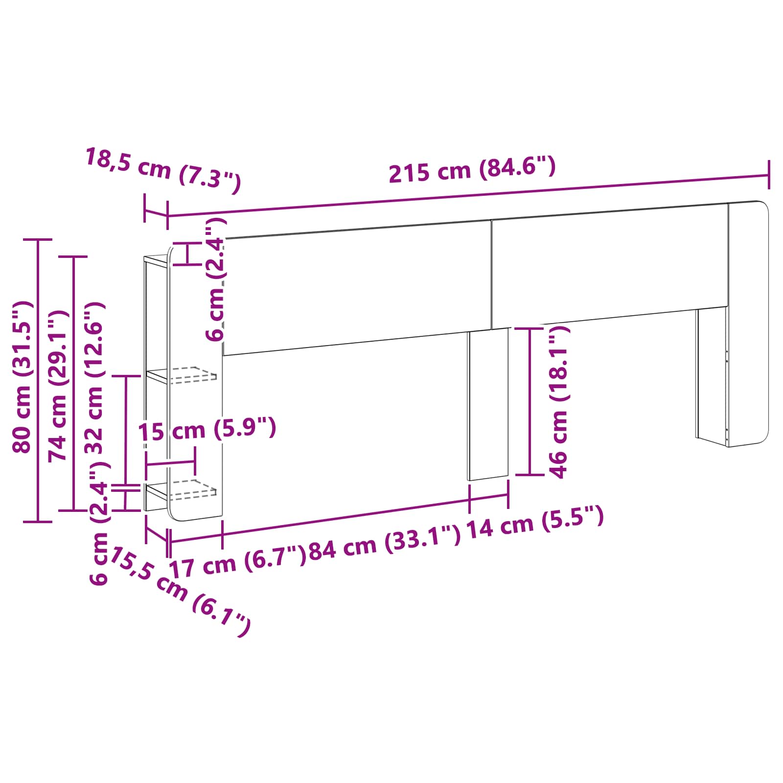 • Celkové rozměry: 215 x 18,5 x 80 cm (D x Š x V)