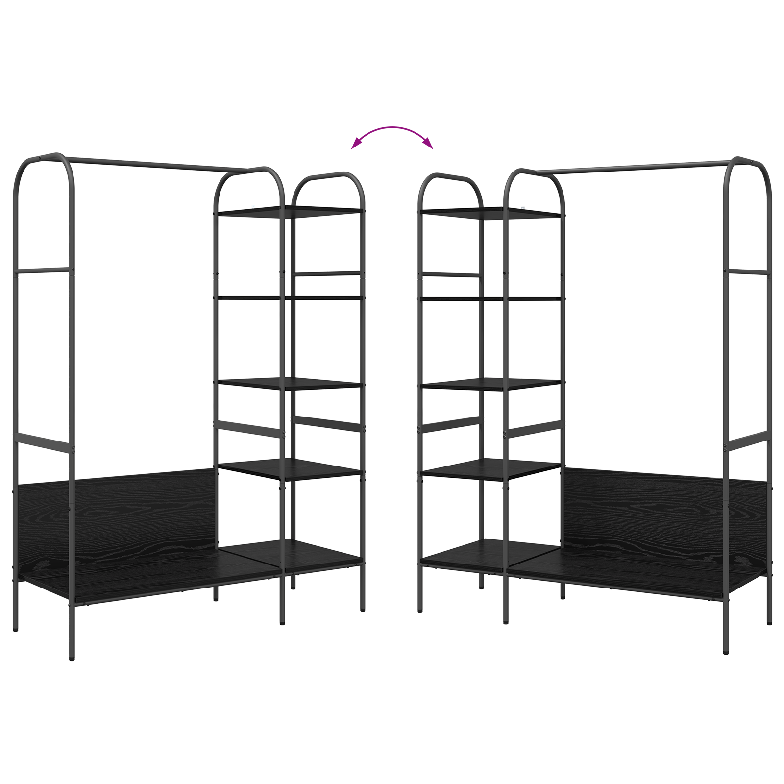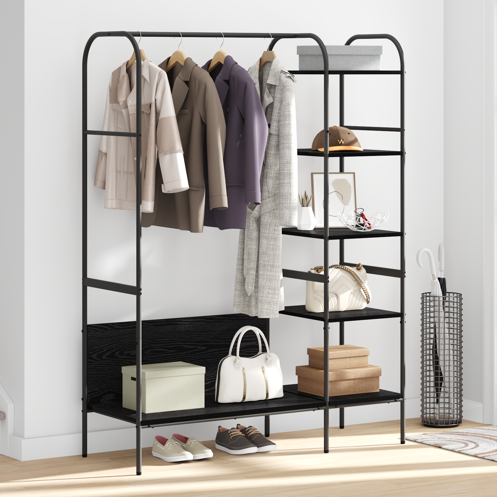 • Integrované úložiště: Nabízí dostatek místa pro uložení oblečení, bot nebo doplňků. Šikovné police z inženýrského dřeva umožňují efektivně vystavit nebo uložit věci, aniž by to vypadalo neuspořádaně.