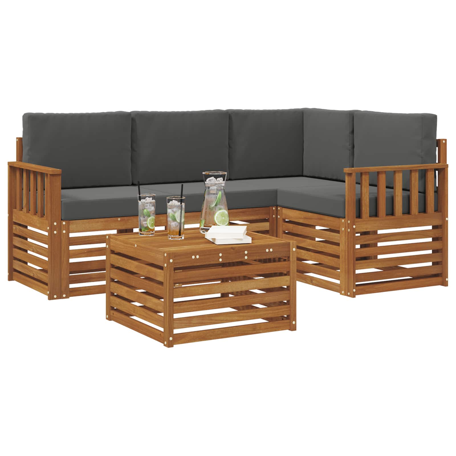Tento set modulárních sedaček přináší moderní design a praktickou funkčnost, což ideálně obohatí každou zahradu, terasu, okolí bazénu nebo dvorek. Vyrobený z masivního akáciového dřeva s bohatou hnědou barvou, set vytváří příjemnou atmosféru. Jeho modulární povaha podněcuje vaši kreativitu a umožňuje snadno měnit uspořádání podle různých příležitostí, od intimních setkání až po velké oslavy.