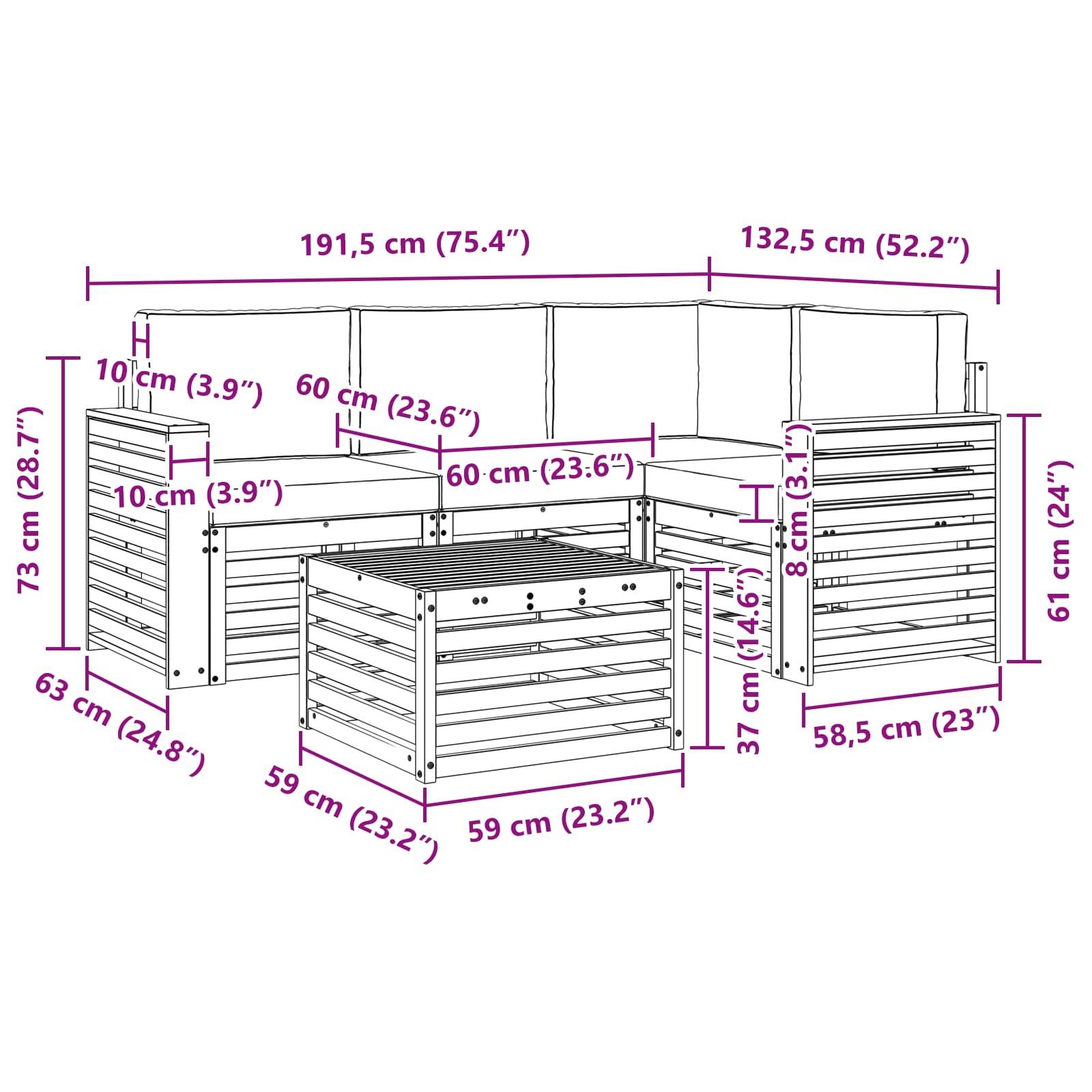 • 1 x Rohová sedačka: 63 x 63 x 73 cm (D x Š x V)