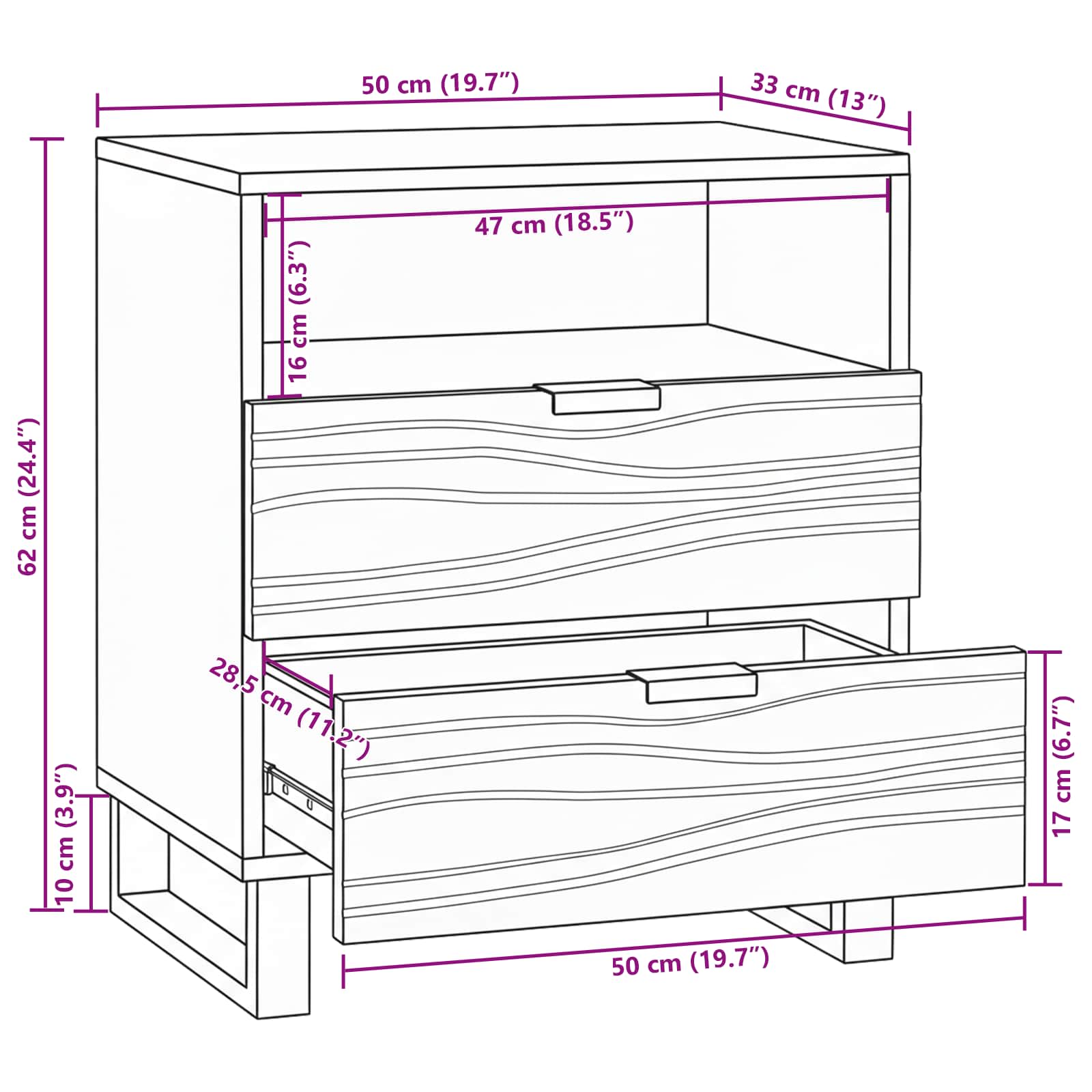 • Funkční úložný prostor Stolek nabízí příjemný prostor pro ukládání různých věcí, jako jsou knihy, elektronika nebo noční potřeby. S tradičními zásuvkami se snadnou úchytkou je přístup k uloženým věcem bezproblémový, přičemž přidává funkčnost a styl do prostoru.