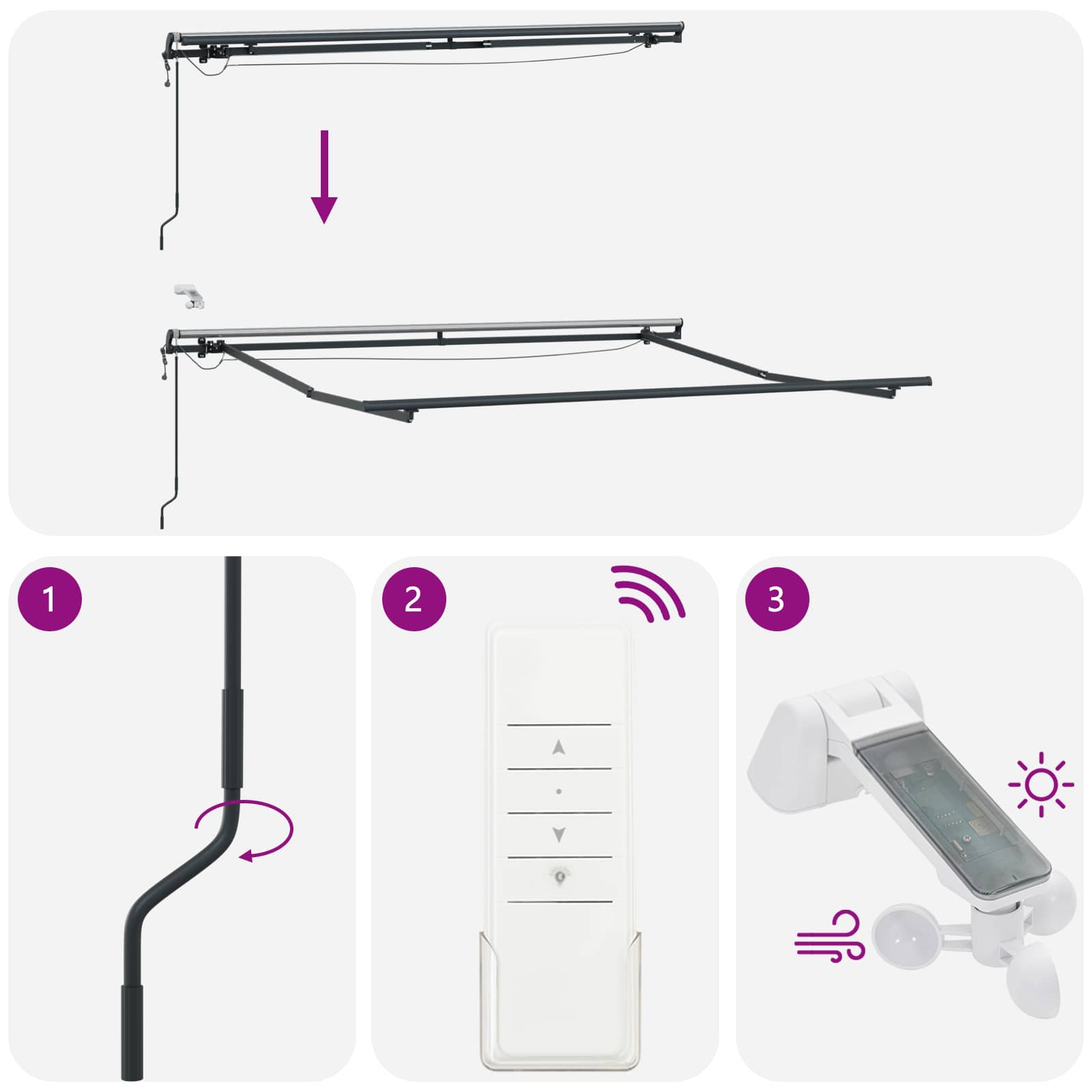 Nebezpečí! Silná pružina. NEODSTRAŇUJTE toto lano, dokud nedokončíte všechny kroky montáže, všechny šrouby nejsou utažené a předmět není připevněn ke zdi! Varování! Při povolování ramen dbejte opatrnosti, neboť jsou pod mechanickým tlakem! Náhlé uvolnění skládacího ramene může způsobit zranění. Varování: Před použitím výrobku si pečlivě přečtěte návod k obsluze. Varování: Používání při teplotách pod bodem mrazu může produkt poškodit. Externí použití v budovách a jiných stavbách. Nedovolte dětem, aby si s ovládacím zařízením žaluzie. Dálkové ovládání uchovávejte mimo dosah dětí.