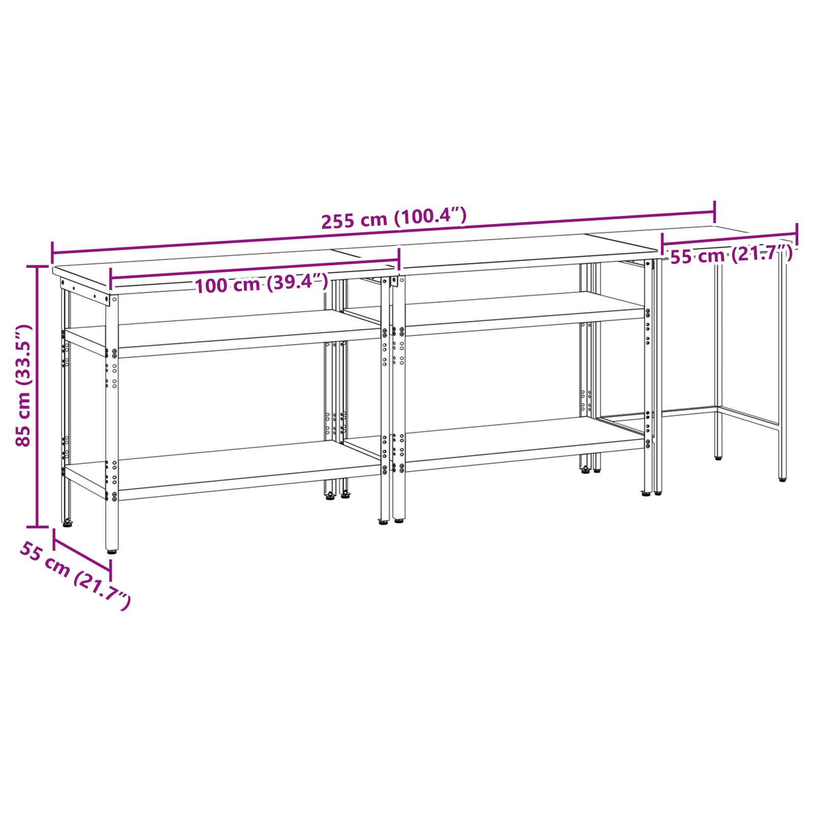 Tato sada pracovních stolů z oceli je ideální kombinací funkčnosti a průmyslového stylu pro profesionální dílny i domácí garáže. Obdélníkový stůl zvládne i těžší úkoly a má moderní design. Díky hladkému povrchu se bezproblémově hodí do jakéhokoliv prostoru. Kovové police poskytují dost úložného místa, takže máte nářadí a potřeby pěkně srovnané a přehledné. Představte si tento stůl jako středobod vašeho pracovního místa, který dodává atmosféru profesionality, pořádku a stylu.
