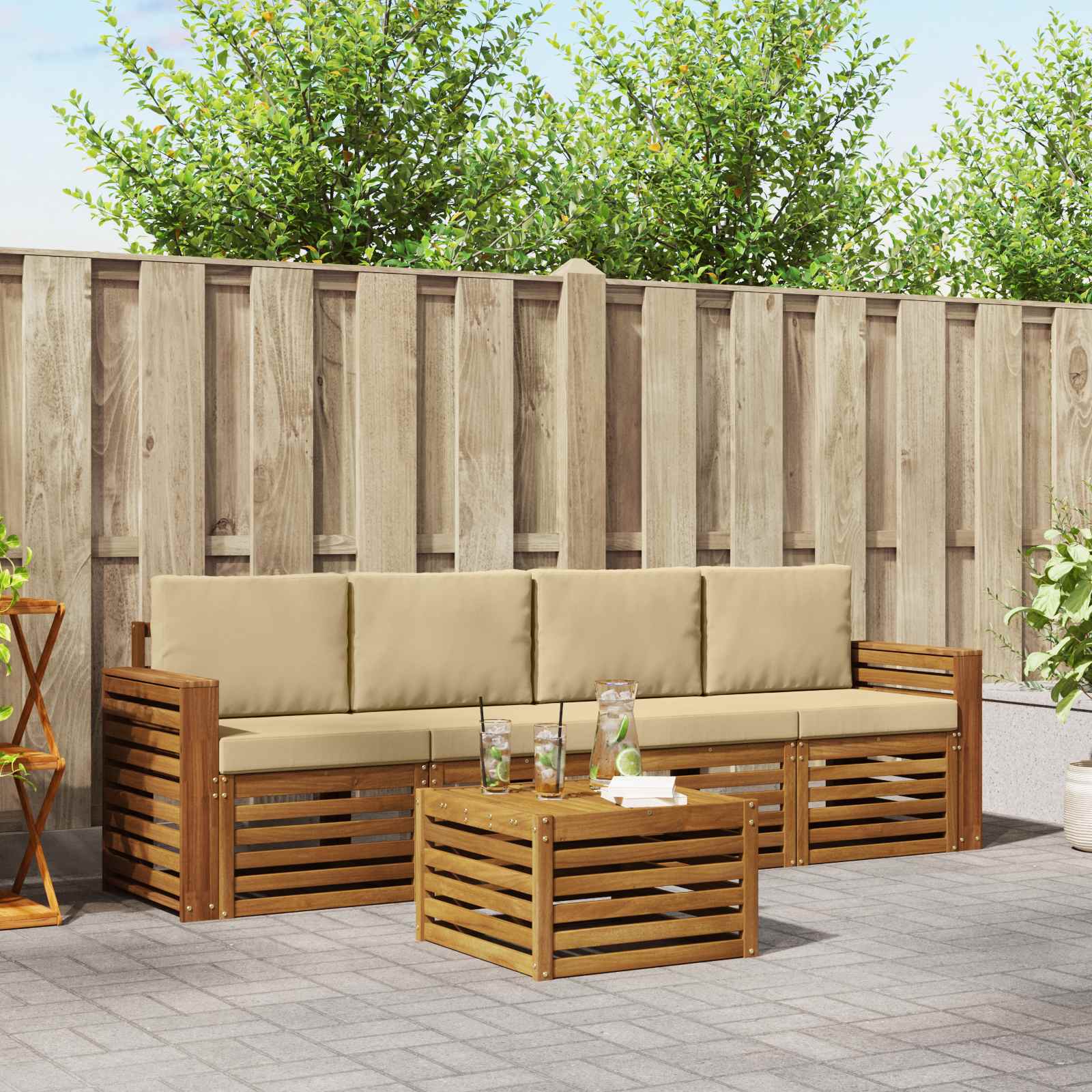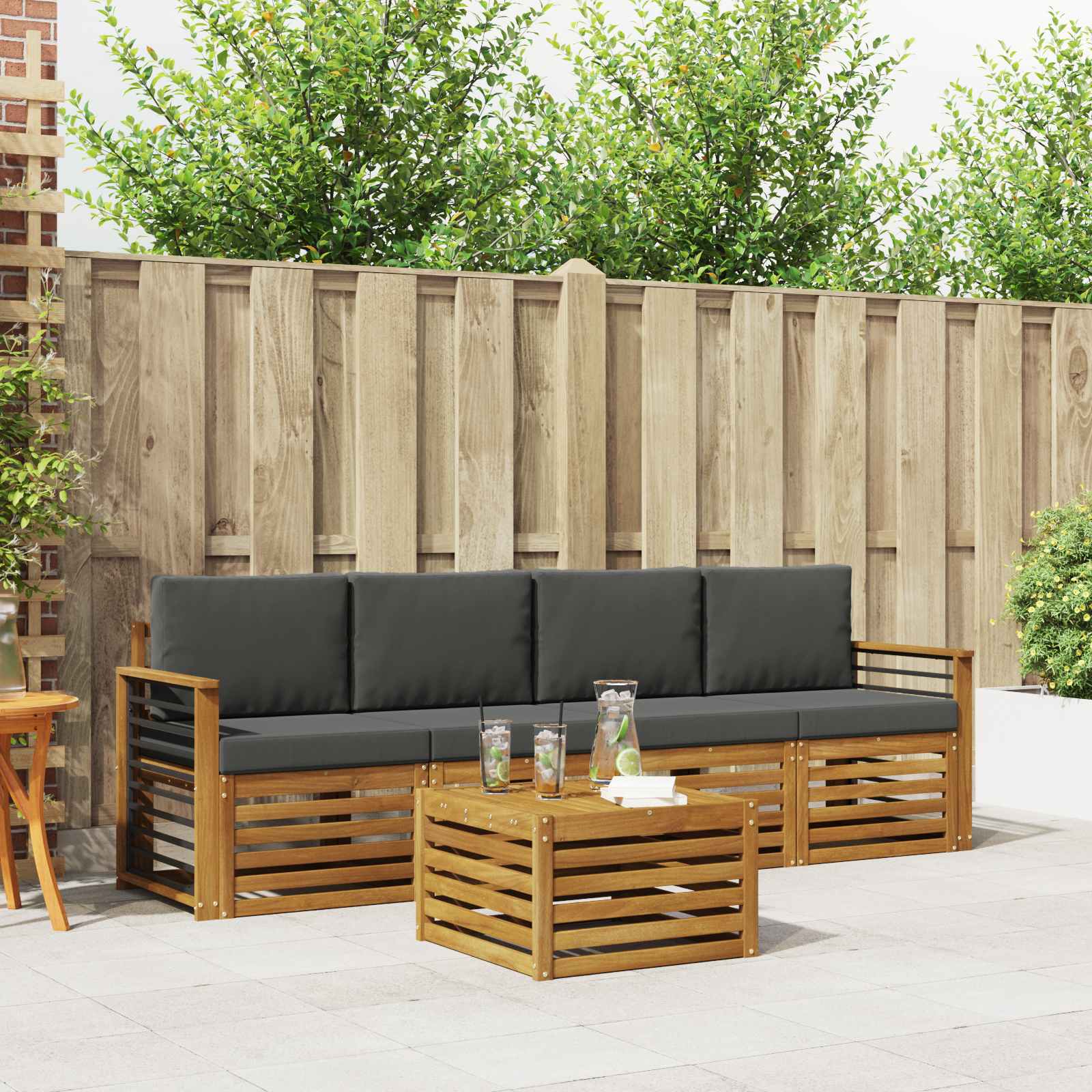 Sada venkovního nábytku spojuje styl a funkčnost. Skvěle se hodí jako středobod pro vaši zahradu nebo terasu. Moderní design s čistými liniemi a minimalistickým vzhledem dodává šmrnc a podporuje venkovní relaxaci a setkání s přáteli. Celá je vyrobena z kvalitního akáciového dřeva, které zaručuje odolnost a trvalý vzhled, ideální pro ty, kteří chtějí spojit praktičnost se stylem. Odolné masivní akáciové dřevo: Tato sada nábytku je navržena tak, aby odolávala venkovním podmínkám. Přírodní teplý tón činí vaši zahradu nebo terasu ještě útulnější. Odolný povrch: Lakovaný povrch poskytuje ochranu proti slunci a mírnému dešti. Zajišťuje dlouhou životnost a zůstává krásný i náročných podmínkách. Styl a funkce: Každý kus je promyšlený pro pohodlí a design. Opatření zajišťují pohodlí a celkový vzhled je velmi atraktivní, ideální pro různé příležitosti. Pohodlí a variabilita: Modulární design vám dovolí nastavit si pohovku, jak budete potřebovat. Skvělá pro relaxaci, večírky nebo klidné chvíle s knihou, přesně se přizpůsobí potřebám vašeho prostoru. Snadná údržba: Pro údržbu stačí otřít vlhkým hadříkem, abyste zachovali vzhled. Pravidelnou péčí zvýšíte trvanlivost a vzhled nábytku.