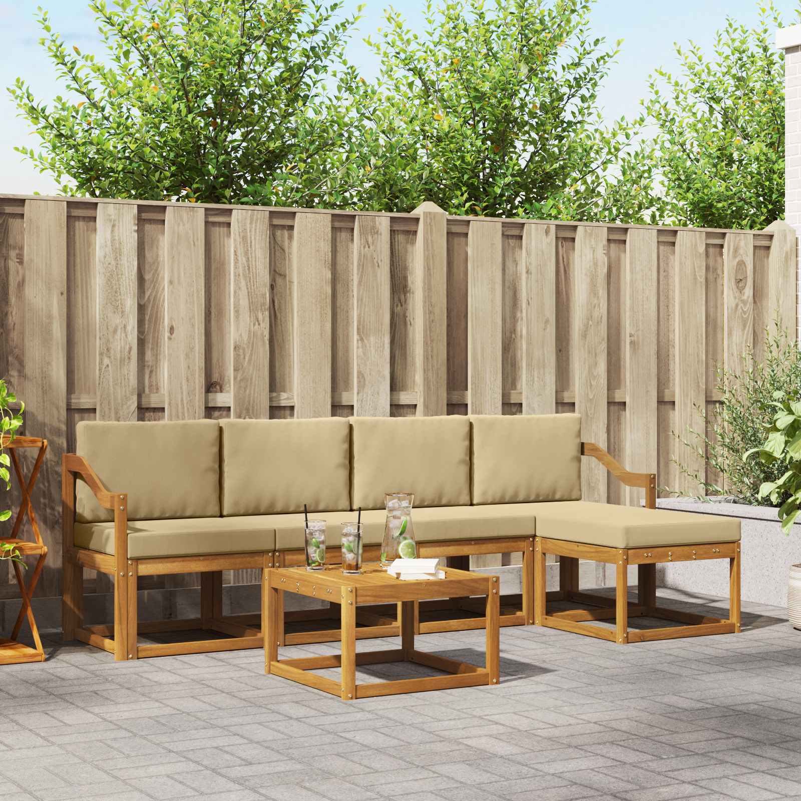 Tento moderní sofa set je pětidílná souprava, která zvyšuje úroveň vašich venkovních prostor díky stylu a funkčnosti. S jeho jednoduchým designem se kombinuje čisté linie a minimalismus, ideální na zahrady, terasy nebo kolem bazénu. Přírodní dřevěné tóny ladí s prostředím a vytvářejí příjemnou atmosféru. Pohodlné silně polstrované polštáře jsou skvělé pro společenské akce nebo mírné lenošení. Odolné materiály zajišťují dlouhou životnost pro venkovní použití. Přírodní dřevěná textura: Sofa set je z akáciového dřeva, což mu dodává přirozený a elegantní vzhled. Zaručuje trvanlivost a dodává vašemu venkovnímu prostoru šarm. Akáciové dřevo je odolné a má dlouhou životnost, což je ideální pro venkovní nábytek. Odolné vůči vyblednutí: Užívejte si krásný vzhled vašeho venkovního nábytku. Jeho odolnost proti vyblednutí zajišťuje, že zůstane čerstvý a nový, i když je vystaven slunci, a to bez ztráty kvality. Snadno omyvatelný: Udržet sofa set v dobré kondici je snadné. Stačí jemně otřít vlhkým hadříkem a prach nebo skvrny jsou pryč. A žádná složitá údržba – šetří vám to čas a úsilí. Podpůrné opěradlo: S těmito opěradly si užijete lepší pozici a komfort. Jsou důležité pro stabilitu při relaxaci nebo čtení venku. Praktické područky: Područky dávají styl a zároveň poskytují další oporu, takže se na nich pohodlně lenoší. Robustní a navržené na trvanlivost z masivního dřeva.