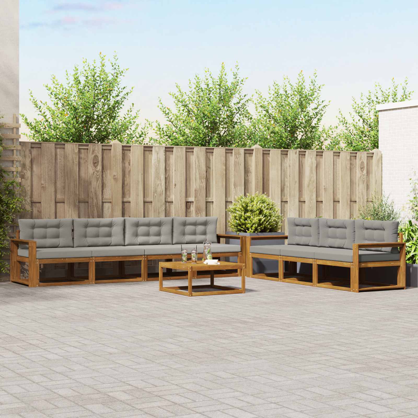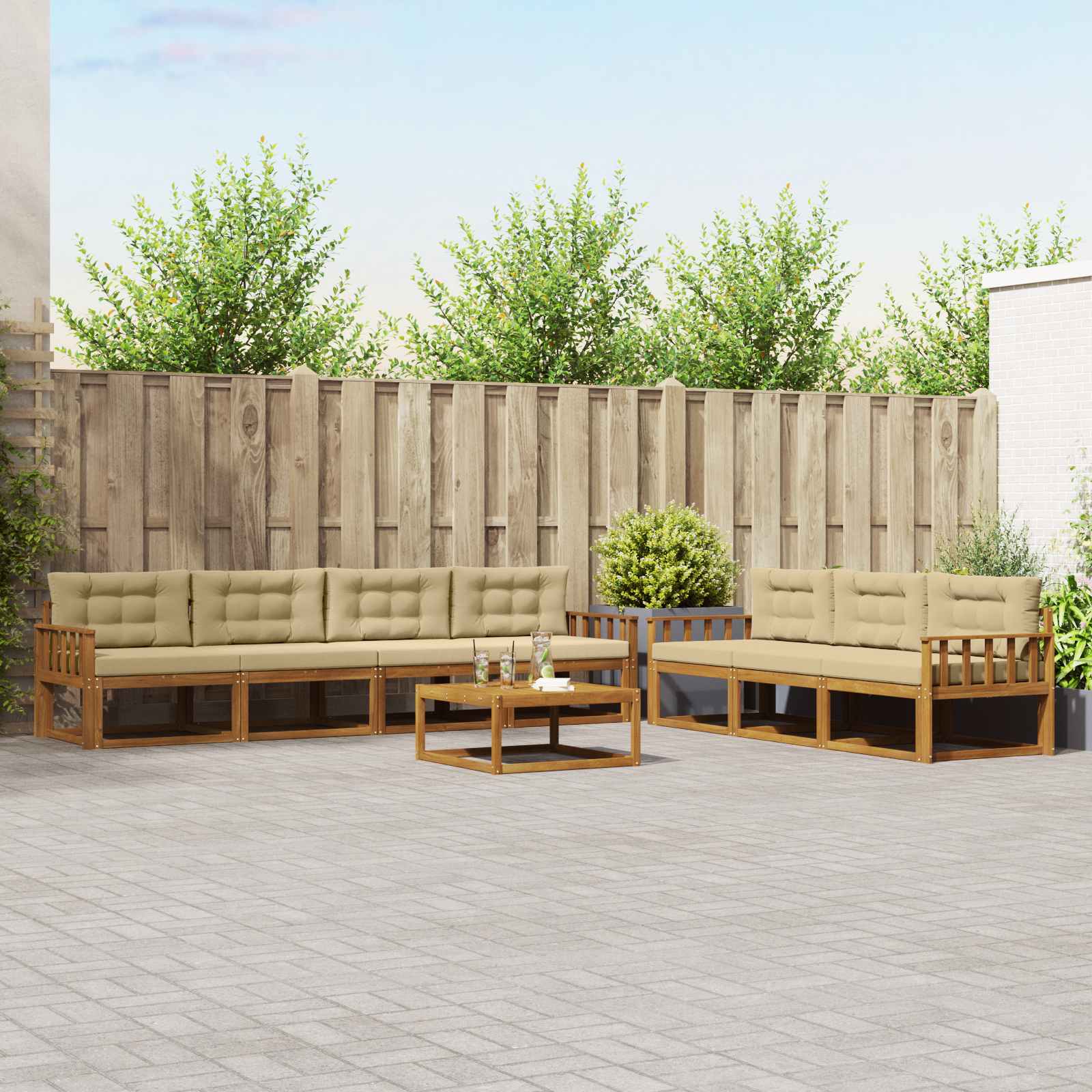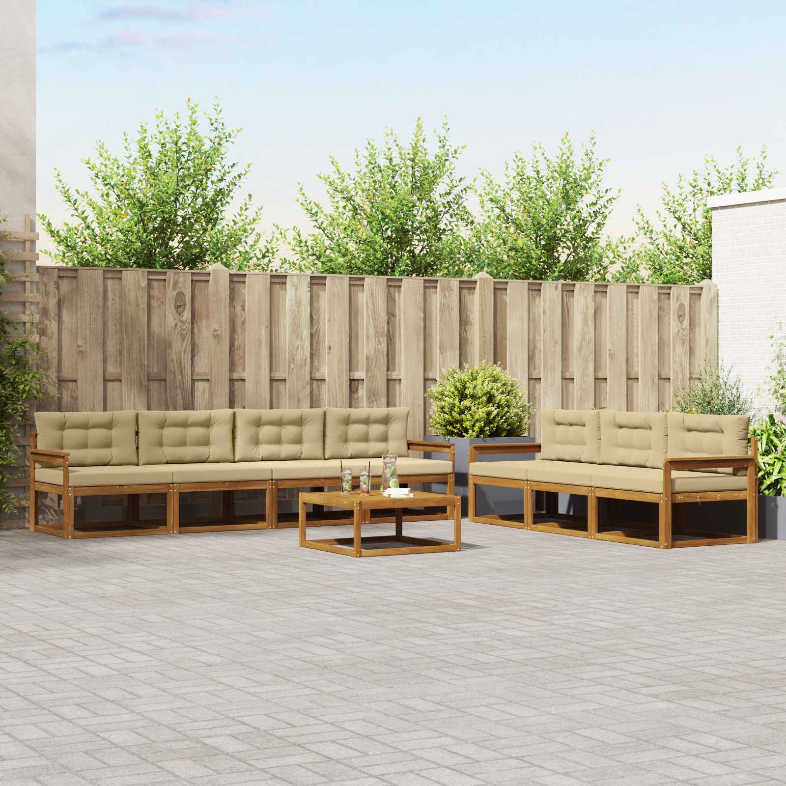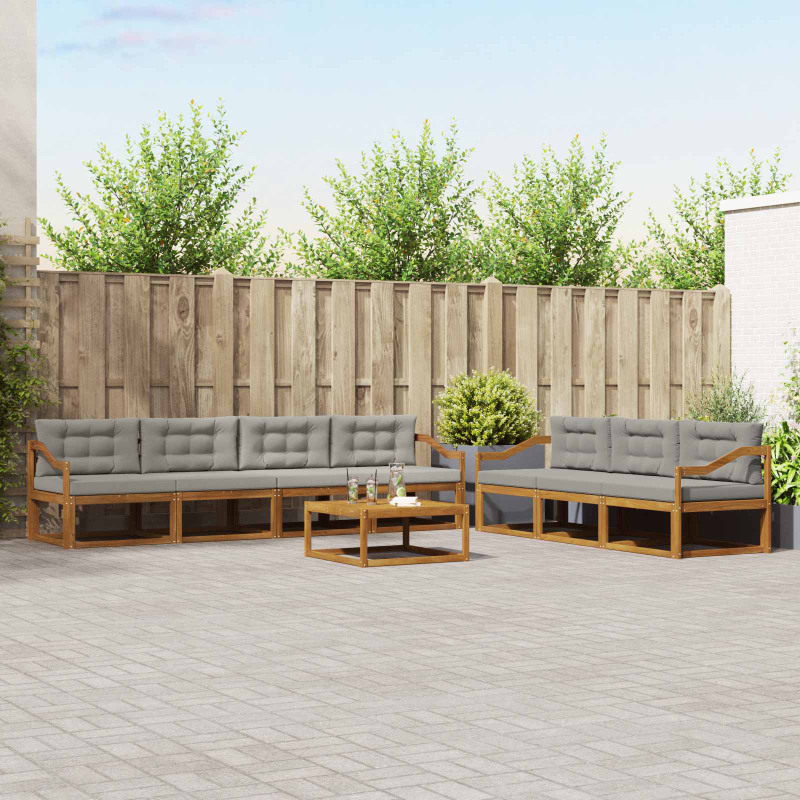 Tento elegantní venkovní pohovkový set dodá každé zahradě, terase nebo prostoru kolem bazénu moderní a modulární design. Jeho štíhlý rám z akáciového dřeva spojuje styl a funkci a vytváří skvělou atmosféru pro odpočinek nebo setkání s přáteli. Masivní akáciové dřevo: Tento pohovkový set je z kvalitního akáciového dřeva, co odolává povětrnostním podmínkám a hmyzu, takže vám bude dlouho sloužit. Má atraktivní strukturu a vypadá skvěle. Robustní konstrukce zajišťuje trvalou oporu a šmrnc. Pevný lamelový rám: Tento pohovkový set má stabilní lamelový rám, co poskytuje dobrou podporu a stabilitu. Díky tomuto designu vypadá moderně a zůstane pevný i při častém používání. S prostorným sezením a super oporou je ideální pro venkovní akce. Odolný povrch proti povětrnostním vlivům: Díky vlastnostem odolným vůči počasí je tento pohovkový set parádní do venkovních podmínek. Povrch akáciového dřeva chrání před slunečními škodami a udrží si barvu a sílu na delší dobu. Určen pro ty, co chtějí odolnost venku bez ztráty stylu. Podporující lamelové opěradlo: Tento pohovkový set má opěradlo, co je navržené tak, aby poskytovalo skvělý ergonomický komfort pro pohodlnou relaxaci po celý den. Podporuje správné držení těla, a tak si ho užijete i na delší sezení. Modulární uspořádání: Jeho modulární design vám dává možnost flexibility při uspořádání, které se hodí pro různé akce. Ať už si chcete odpočinout s knížkou nebo uspořádat venkovní párty, tento set se snadno přizpůsobí vašim potřebám, nabízí funkci a všestrannost.