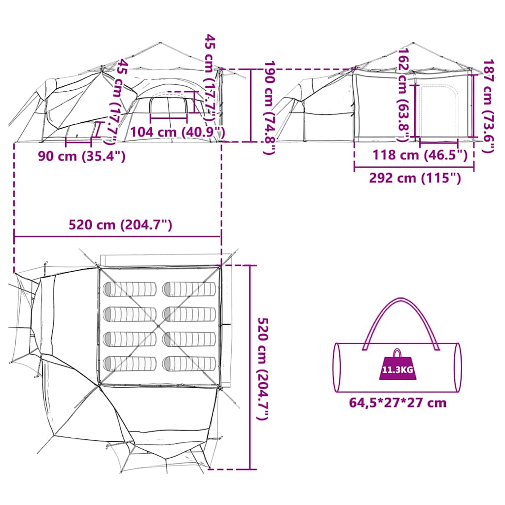 Rodinný stan je skvělý pro všechny venkovní nadšence, kteří potřebují velký a všestranný prostor během kempování. Moderní design s čistými liniemi je kombinací elegance a praktickosti. Ať už ho postavíte na zahradě nebo kdekoli venku, vy poskytuje pohodlné útočiště pro rodinu či partu přátel, kteří ocení jak styl, tak prostornost.