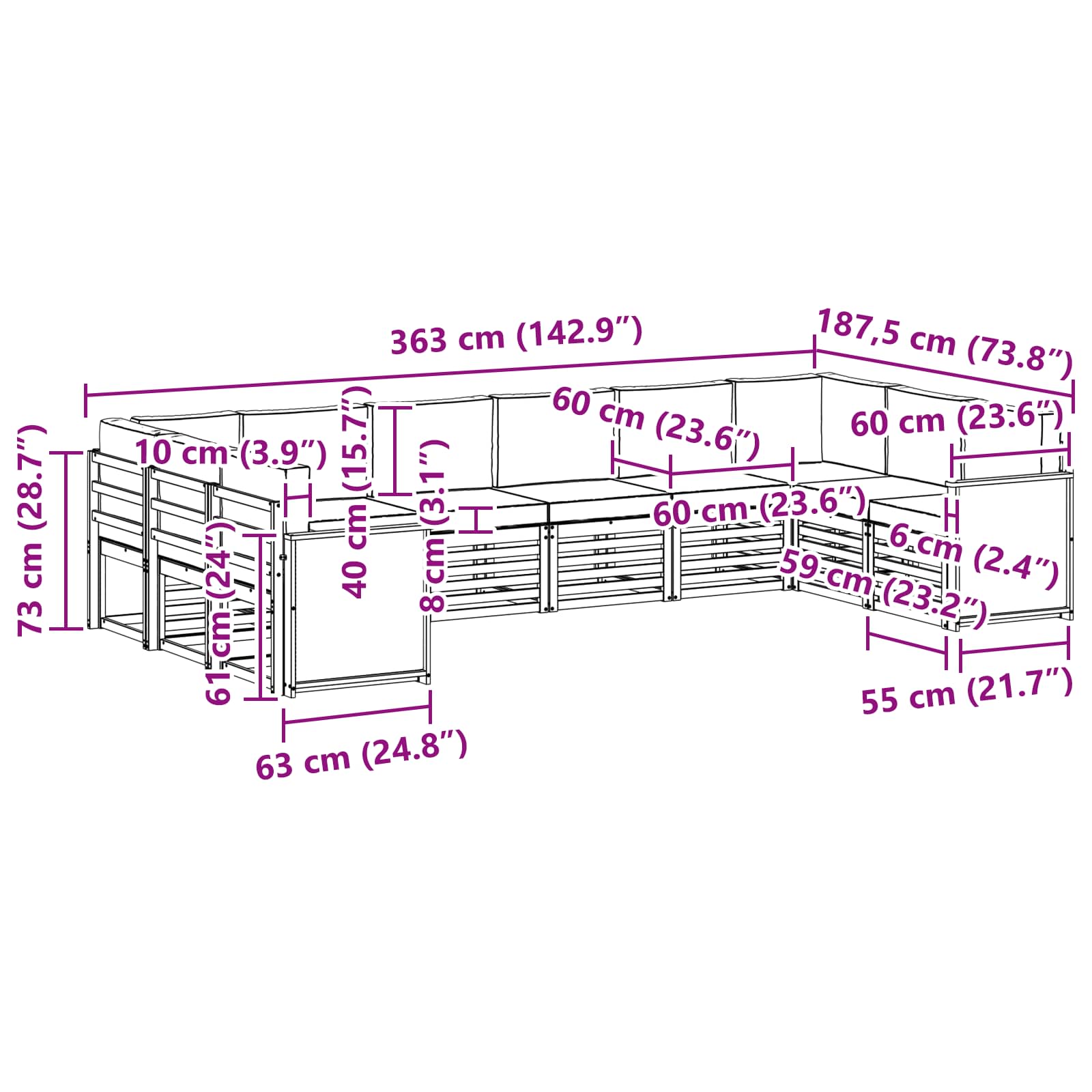• 8 x Středová pohovka: 63 x 59 x 73 cm (D x Š x V)
