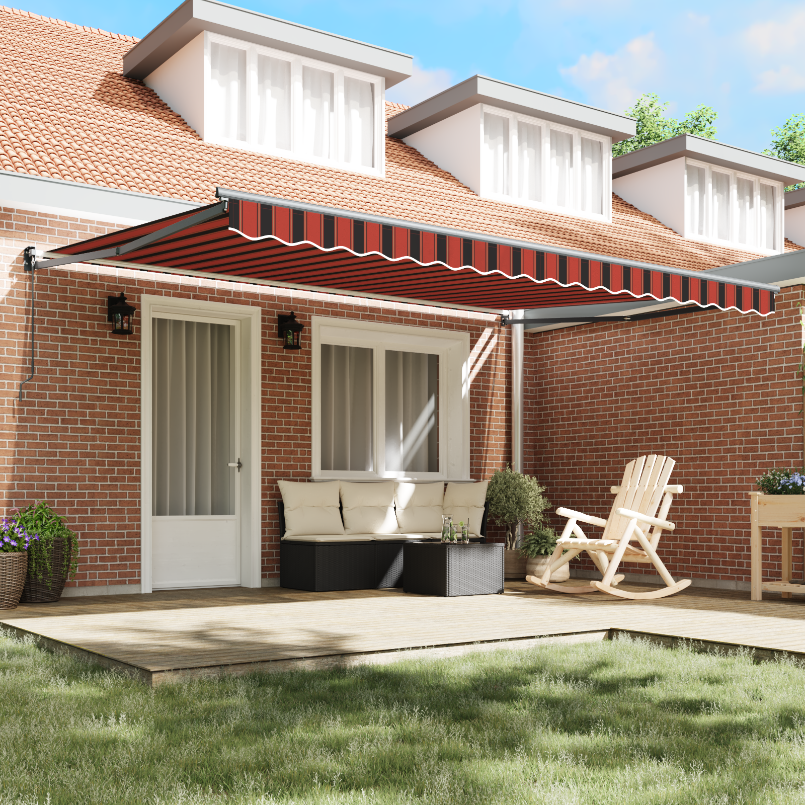 Tato výsuvná markýza spojuje styl a praktičnost, a hodí se do jakékoli zahrady nebo terasy. S moderními, čistými liniemi a minimalistickým designem nabízí přizpůsobitelný stín a přidává šmrnc venkovním prostorům. Je vizuálně atraktivní díky živé barevné kombinaci oranžové a hnědé, což je univerzální řešení perfektní na léto.