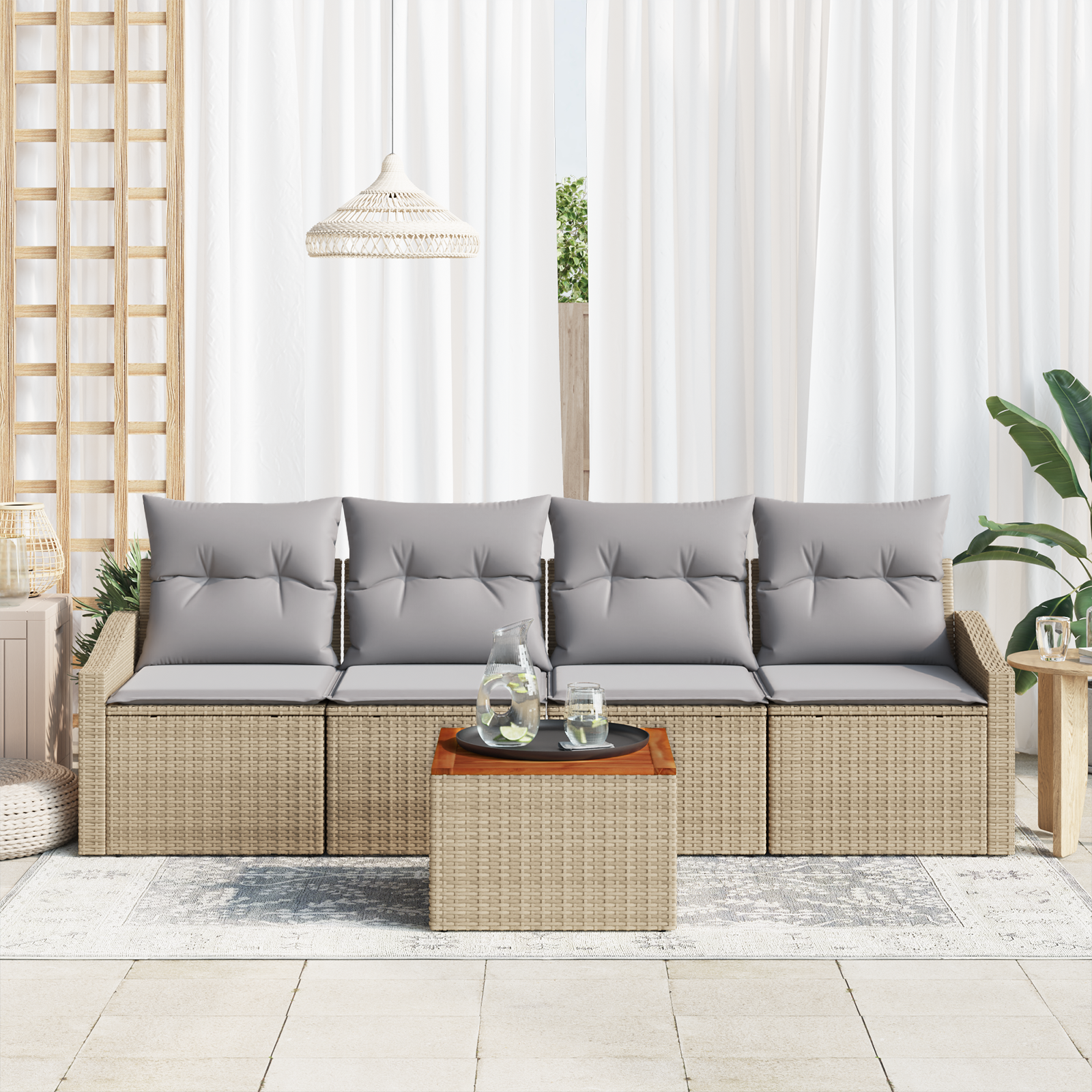 Tato modulární zahradní sofa setka změní váš venkovní prostor designem, který je stylový a funkční. Skvělý na jaro a léto, modární set se vyznačuje jednoduchými liniemi a minimem ozdob, takže se hodí do každé zahrady nebo na terasu. Je vyroben z poly ratanu a masivního akáciového dřeva, což zajišťuje pevnost a eleganci. Vezměte si svoje přátele a vychutnejte si sluníčko v pohodlí.