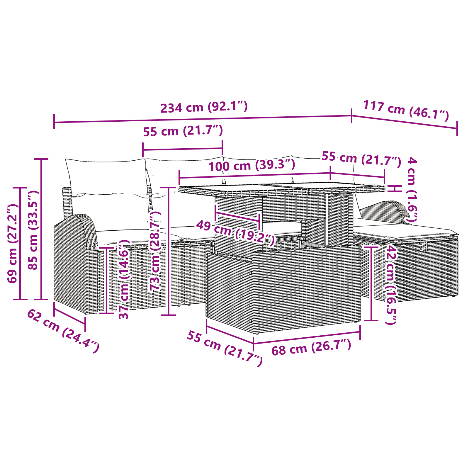 Tato modulární zahradní pohovka nabízí skvělý venkovní zážitek, spojuje moderní styl s funkčností. Elegantní, čisté linie ukazují na jednoduchost, zatímco prostorný obdélníkový tvar zvěstuje relaxaci. Skvělá pro skupinové akce nebo klidné ústupy, by měla potěšit každého, kdo hledá kombinaci formálnosti a neformální elegance na své zahradě nebo terase.