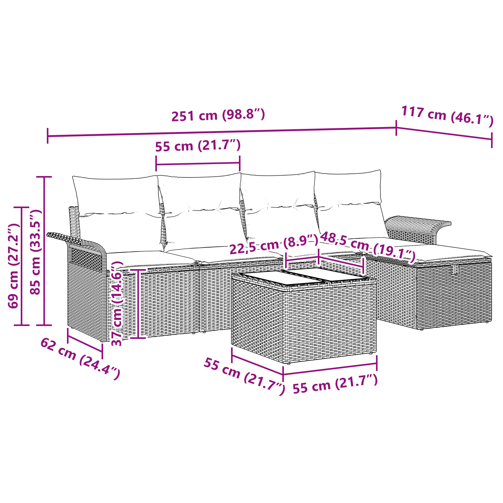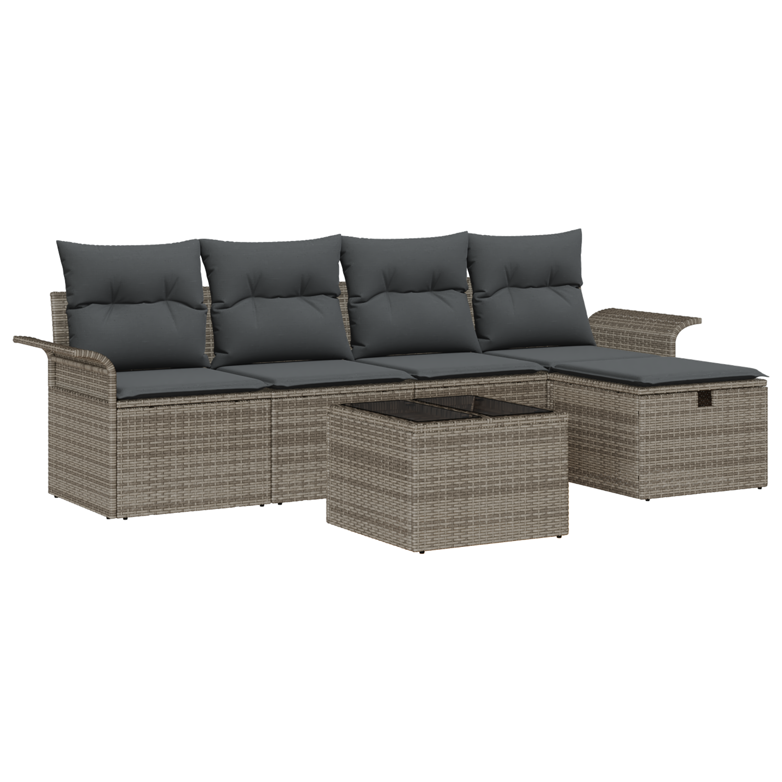 Tento modulární zahradní sofa set je skvělou volbou pro každého, kdo hledá stylové a funkční venkovní sezení. Jeho moderní design má jednoduché linie a maximální funkčnost. Perfektně se hodí na zahrady a terasy a nabízí nejen dobrý vzhled, ale i praktické výhody.