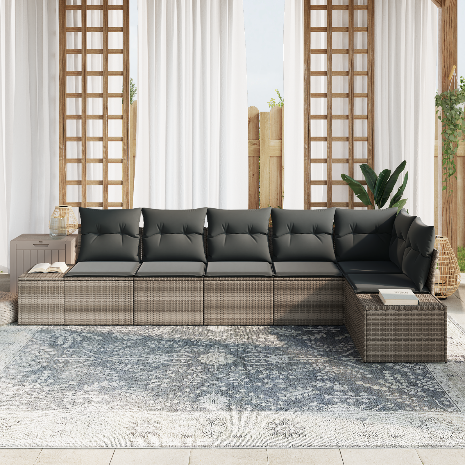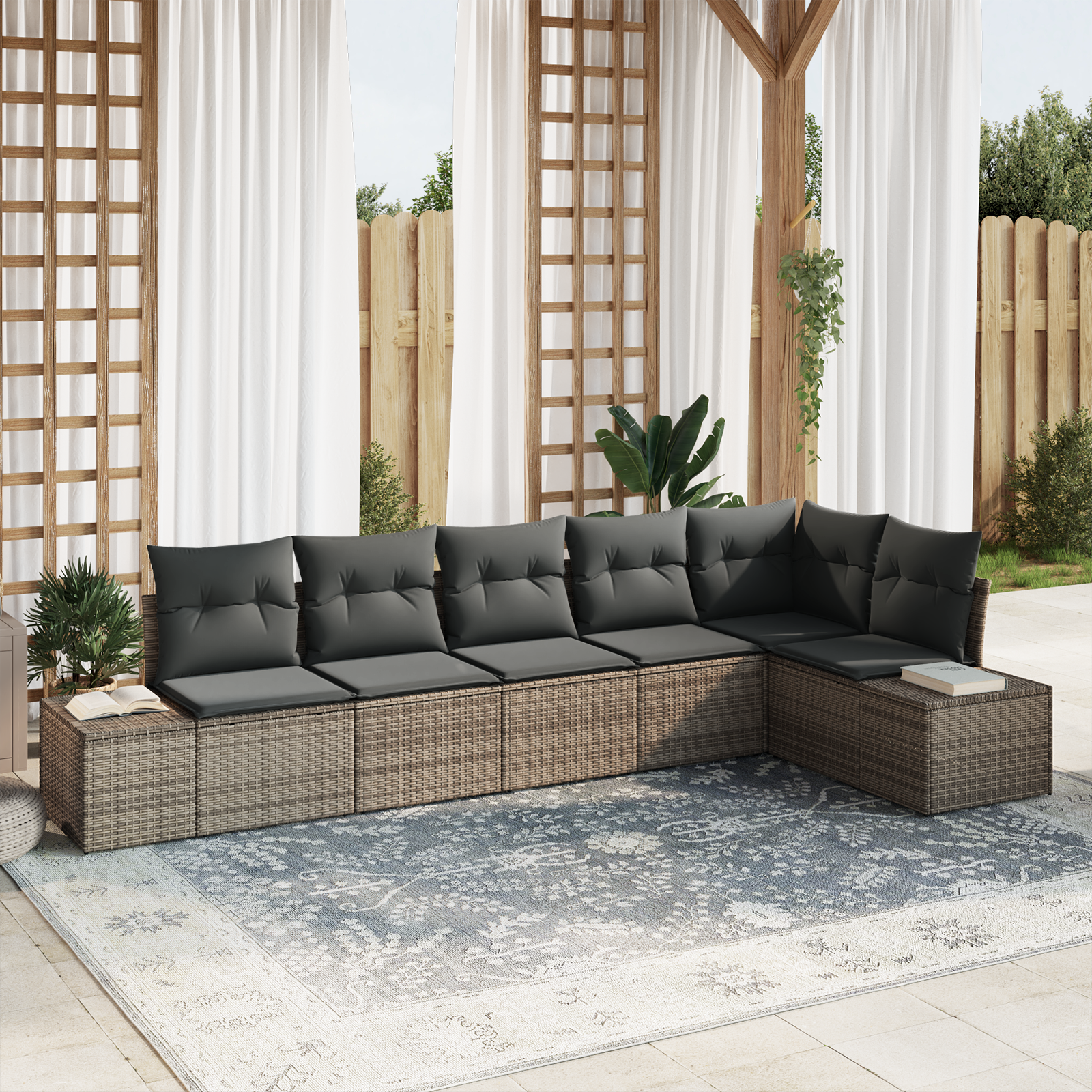 Tento modulární zahradní gauč na první pohled sladí moderní vzhled s praktičností, takže se skvěle hodí do jakékoli zahrady nebo outdoorového prostoru. Elegantní design vyniká čistými liniemi a multifunkčností, přesně jak se nosí v moderním bydlení. Je ideálním kouskem pro venkovní nadšence, kombinuje skvělý vzhled s funkčností a poskytuje luxusní místo na relaxaci. Skládá se z různých modulů, což umožňuje úpravu podle vašich představ a potřeb. Tento set dodává šarm a je perfektní pro setkání s přáteli nebo klidné chvíle o samotě, přičemž nabízí pohodlí i odolnost.