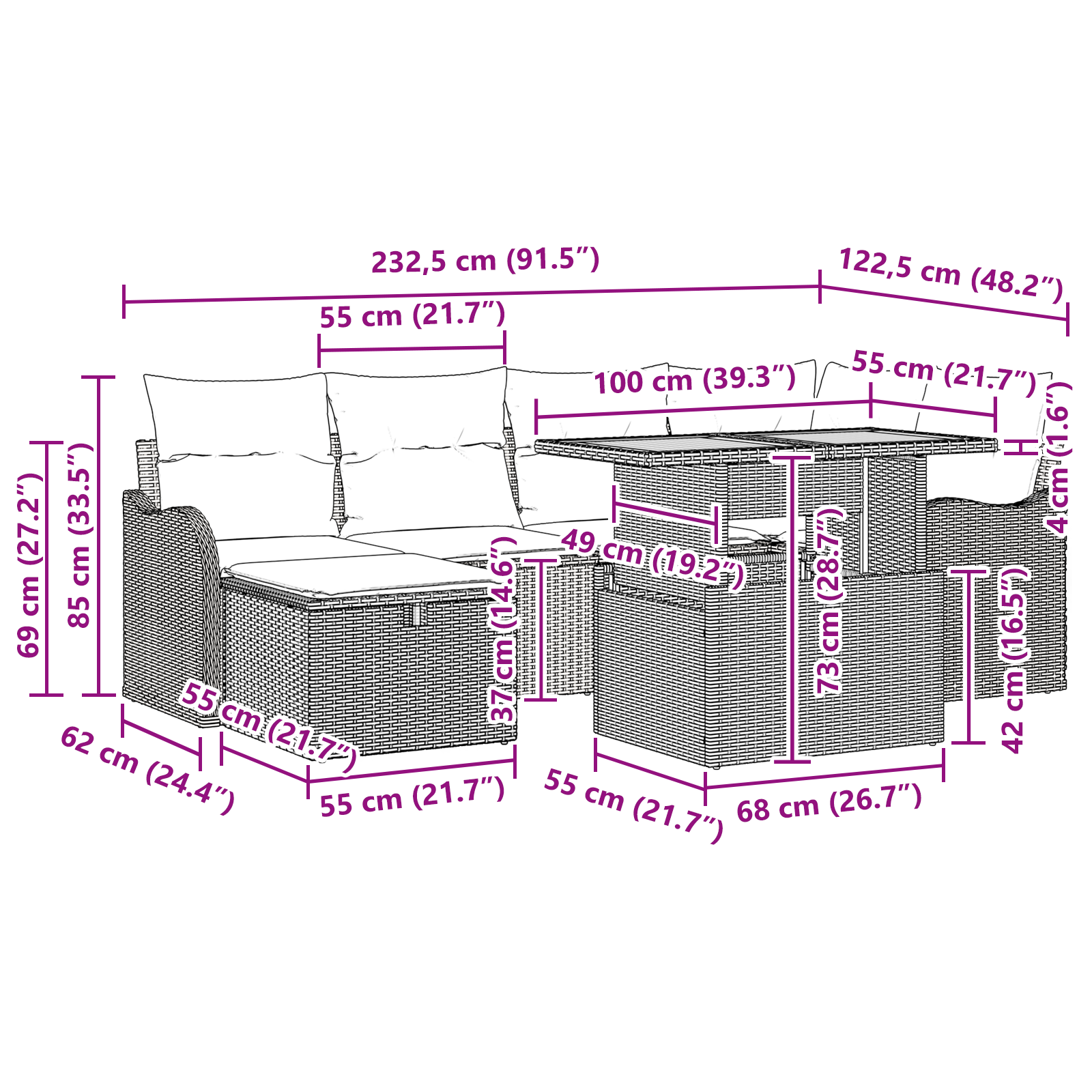 • Doporučené použití: Skvělé pro zahrady, terasy a venkovní lounge. Tento pohovkový set se hodí jak pro domácí tak pro veřejné účely. Jeho všestrannost ho činí ideální volbou pro různé události, od neformálních sobotních odpočinků po sofistikované večeře.