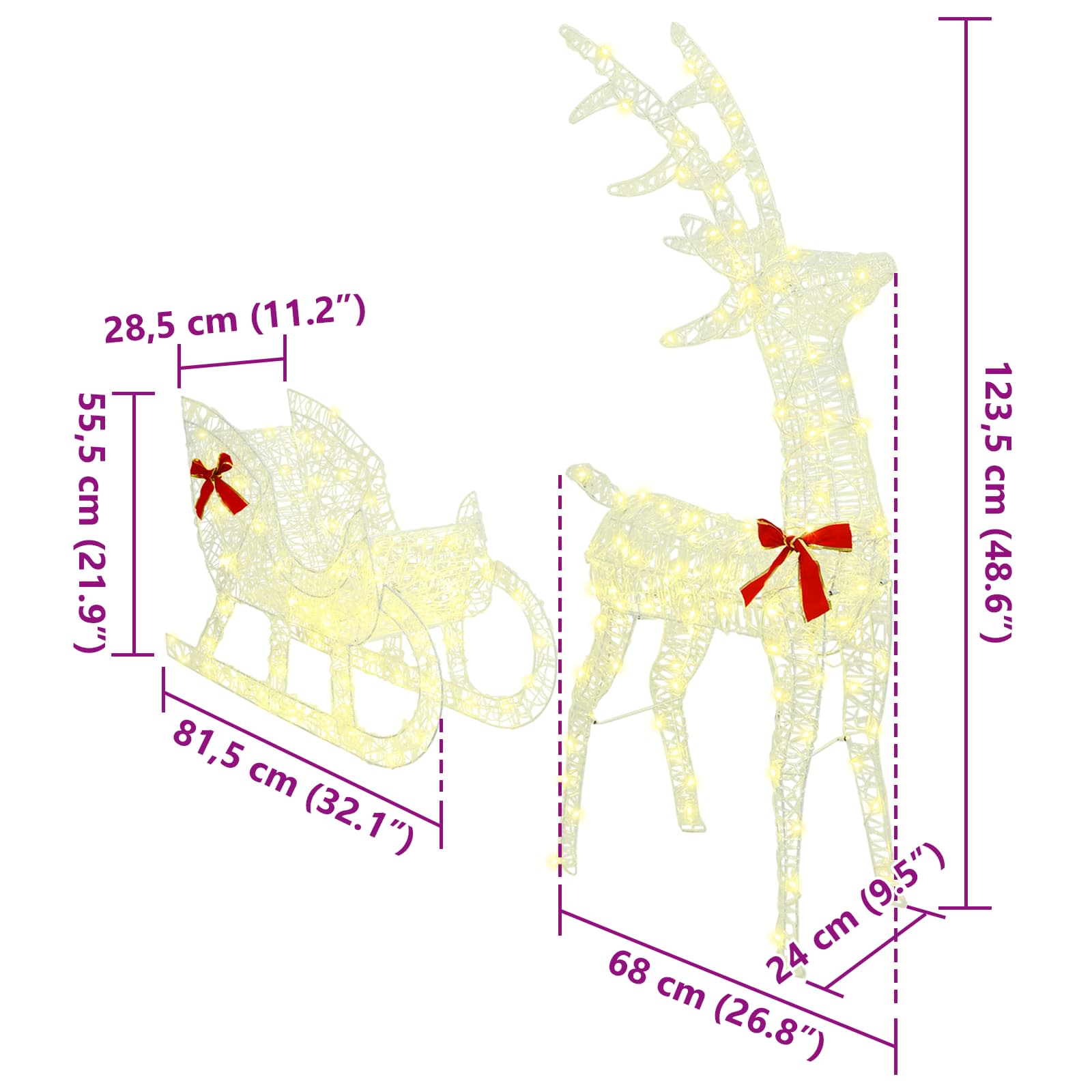 Toto moderní sněžné spřežení sobů přináší vánoční kouzlo do vašeho domova. Je vyrobené z odolného akrylu a má minimalistický design obohacený o klasickou červenou mašli pro sváteční atmosféru. Vhodné pro vnitřní a kryté venkovní prostory, je ideálním doplňkem pro jakýkoli vánoční motiv a spojuje moderní jednoduchost s tradiční elegancí. Představte si, jak tento kousek rozjasňuje vaše rodinné setkání svým nádherným vzhledem a vytváří atmosféru klidu i radosti ve vašem obývacím pokoji.