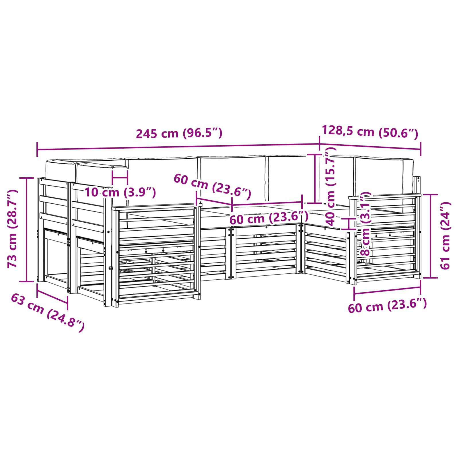 • 4 x Střední pohovka: 63 x 59 x 73 cm (DxŠxV)