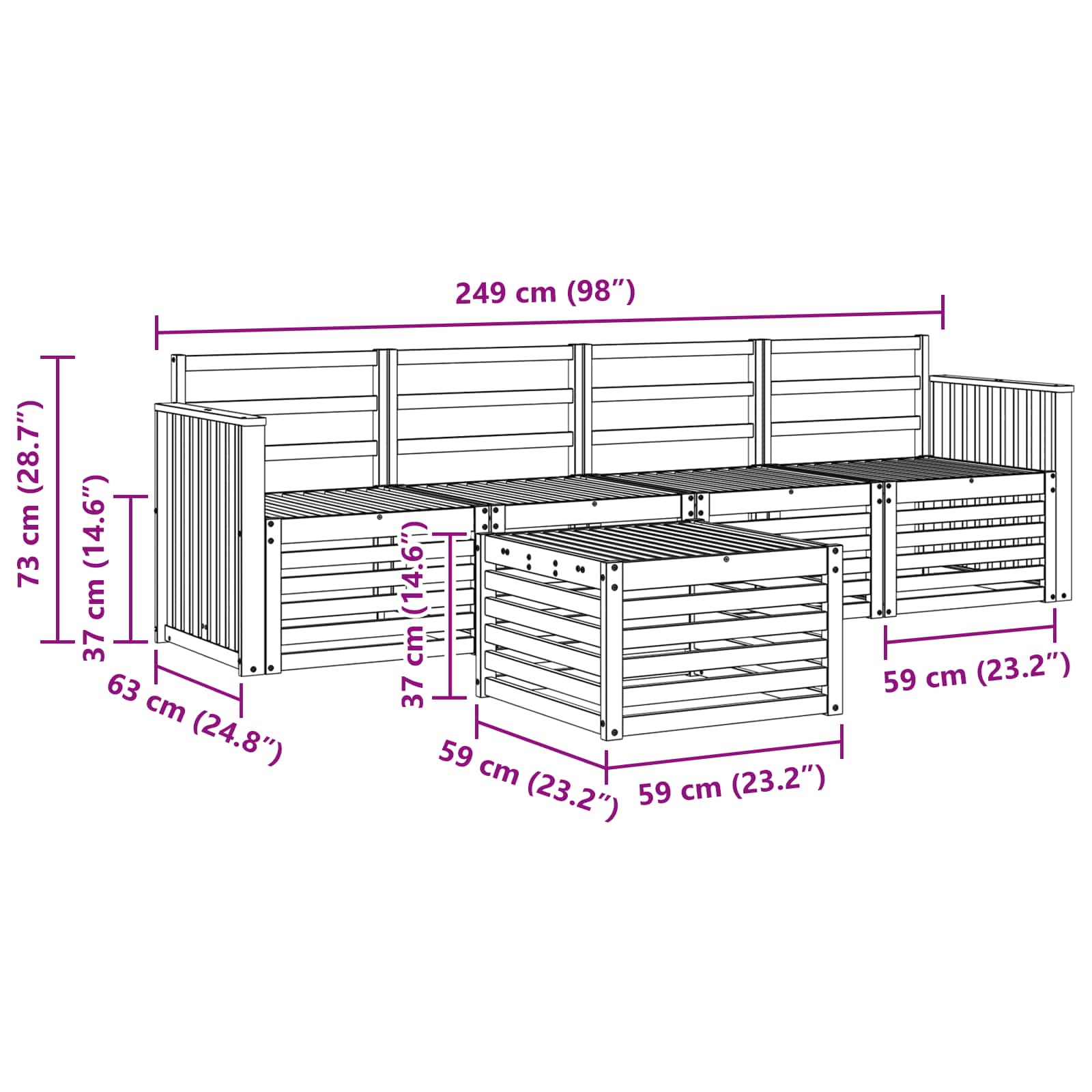 • 4 x Střední pohovka: 63 x 59 x 73 cm (D x Š x V)