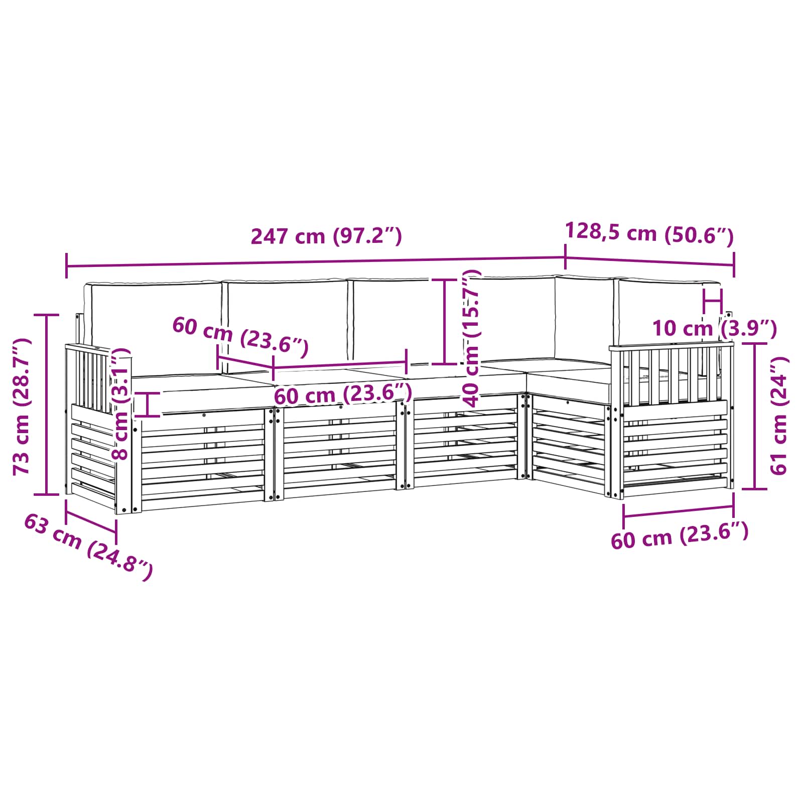 • 5 x Sedací polštář: 60 x 60 x 8 cm (D x Š x V)