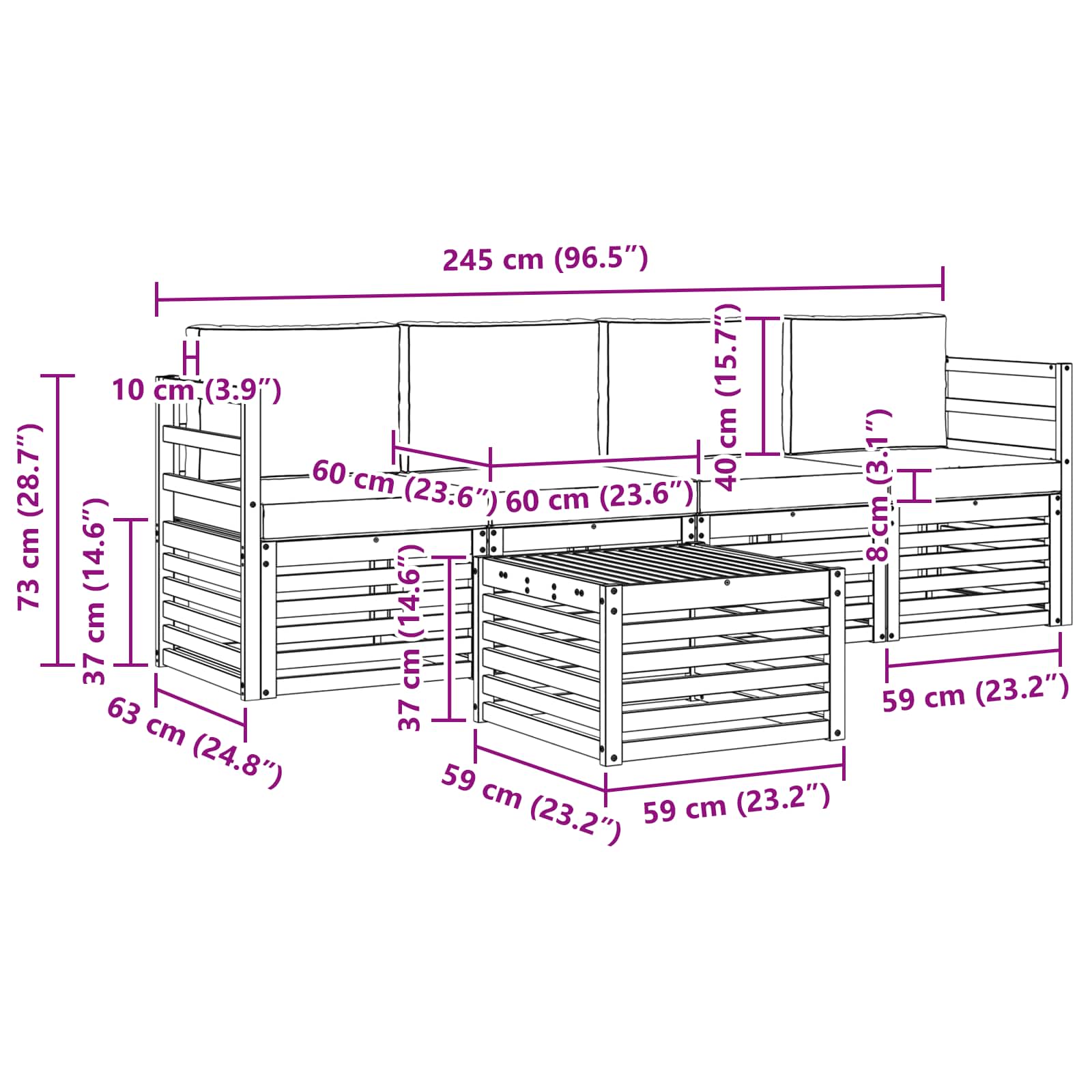 • 4 x Středová pohovka: 63 x 59 x 73 cm (DxŠxV)