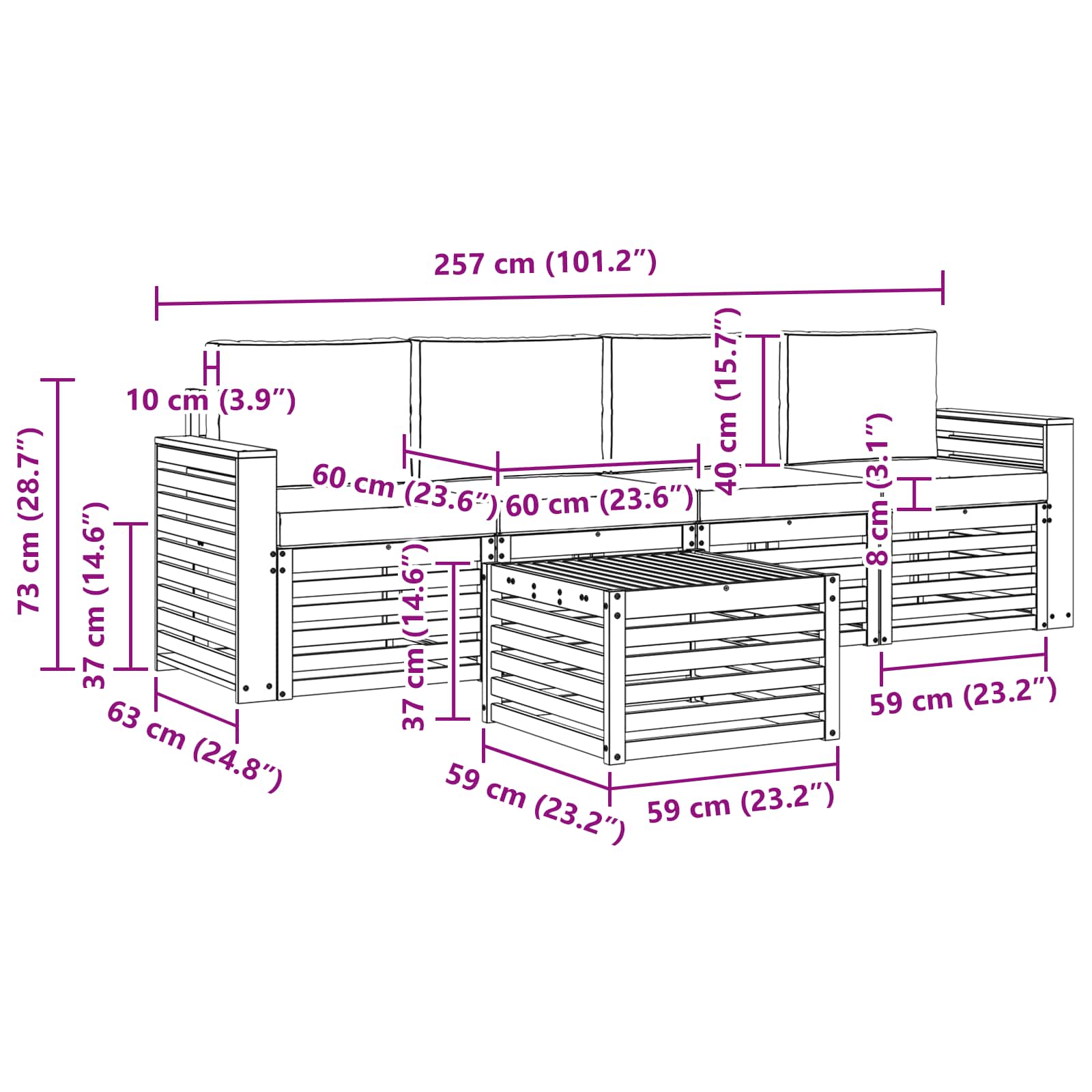 • 4 x Středová pohovka: 63 x 59 x 73 cm (DxŠxV)