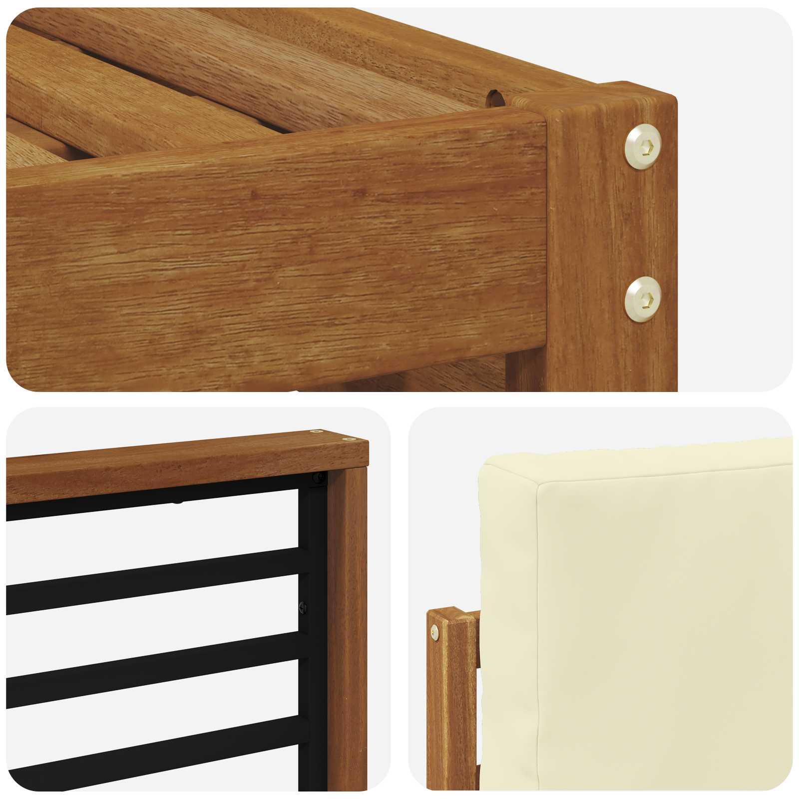 • Vynikající akácie: Souprava je z masivního akáciového dřeva, které je odolné a přitom krásné. Je ideální pro venkovní podmínky a ustojí rozmary počasí, aniž by ztratilo vzhled.