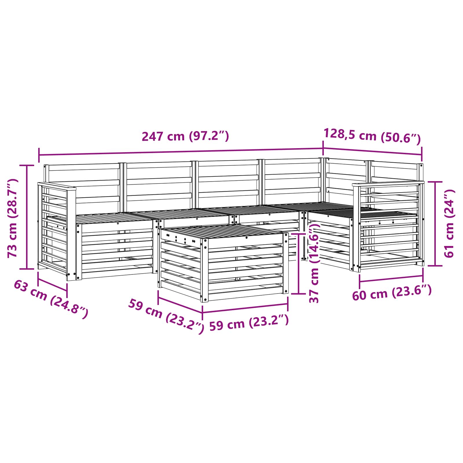 • 4 x Střední pohovka: 63 x 59 x 73 cm (D x Š x V)