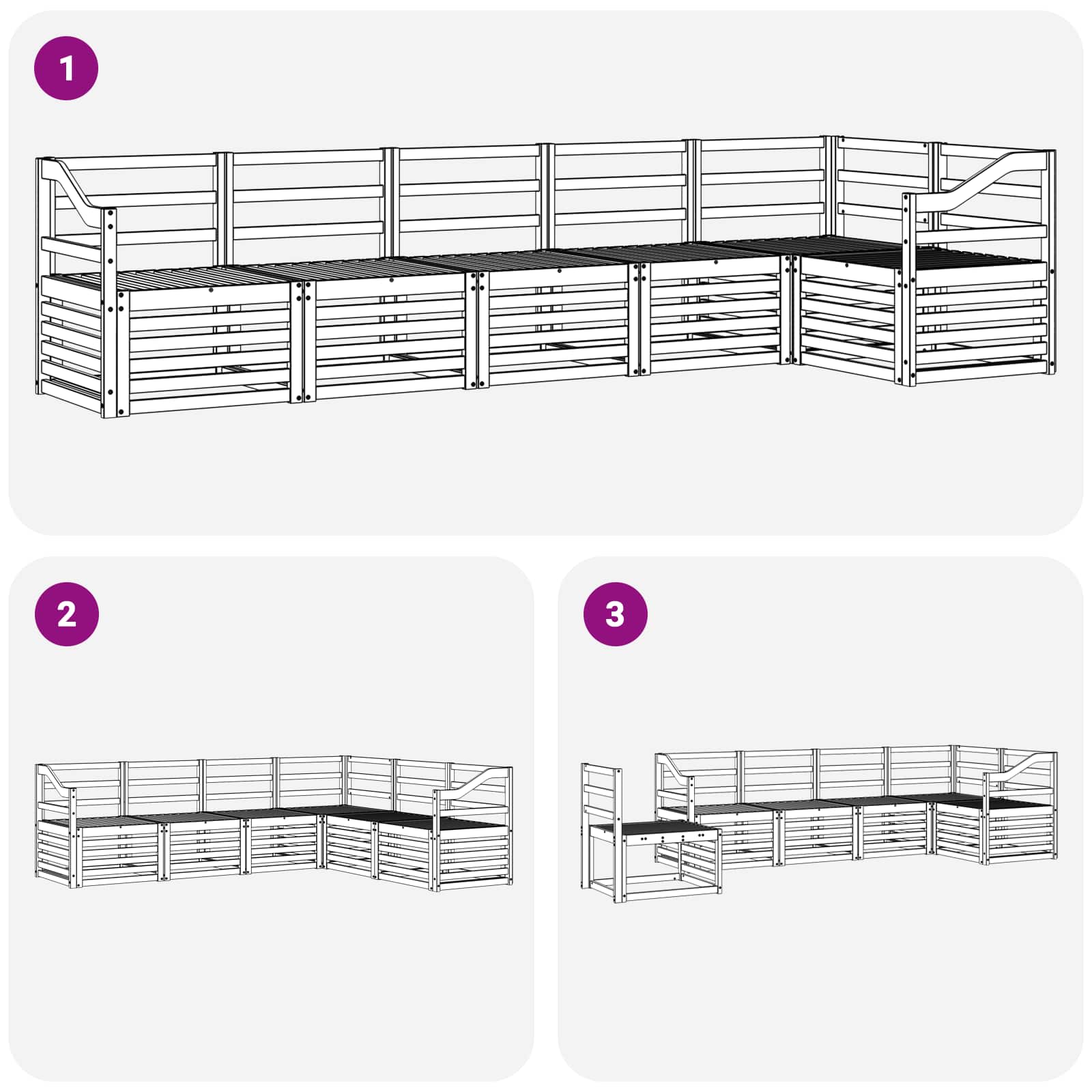 • Pohodlí a variabilita: Modulární design umožňuje flexibilní uspořádání, které se přizpůsobí různým prostorům a potřebám. Perfektní pro relaxaci nebo společenské chvíle, tento set se lehce přizpůsobí jakémukoli venkovnímu prostředí.