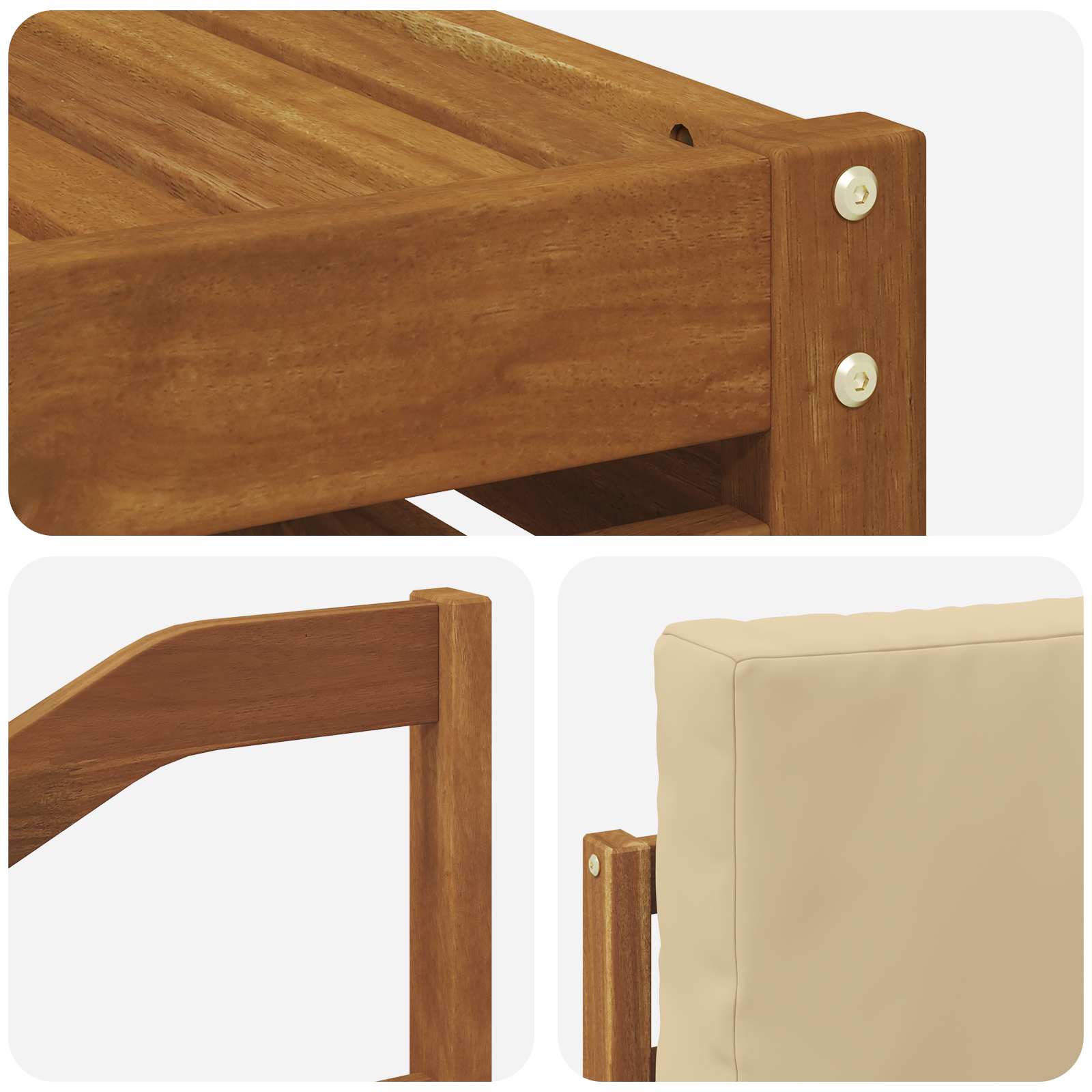 • Odolné masivní akáciové dřevo: Tato venkovní souprava nábytku je z akáciového dřeva, které je známé pro svou odolnost. Pevná konstrukce zaručuje spolehlivost a stabilitu, zatímco teplý přírodní tón skvěle doplní jakoukoli zahradu nebo terasu.