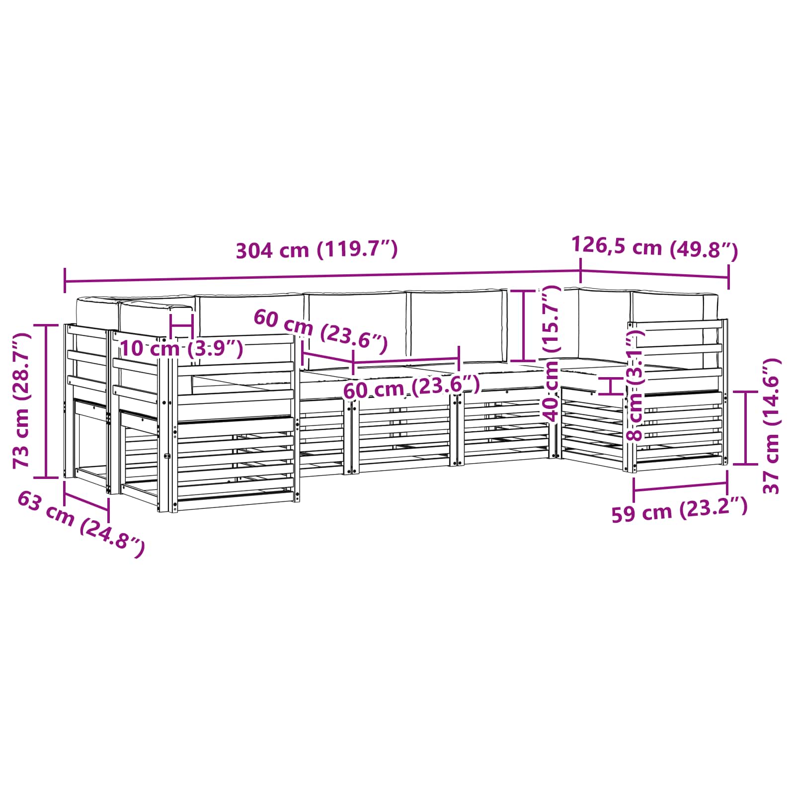 • 5 x Střední pohovka: 63 x 59 x 73 cm (D x Š x V)