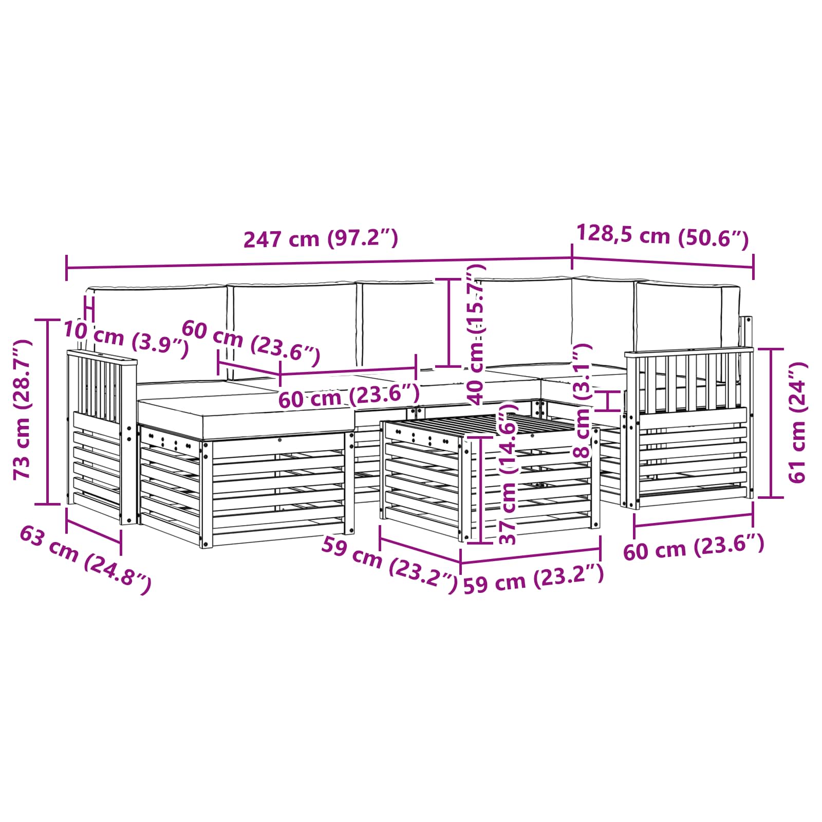 • 6 x Sedáky: 60 x 60 x 8 cm (D x Š x V)