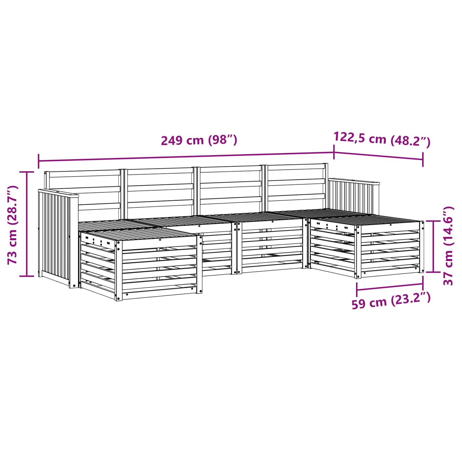 • 4 x prostřední pohovka: 63 x 59 x 73 cm (D x Š x V)