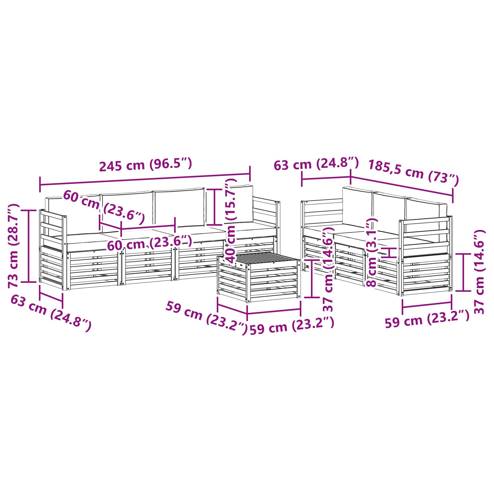 • 7 x Polštář na sezení: 60 x 60 x 8 cm (D x Š x V)