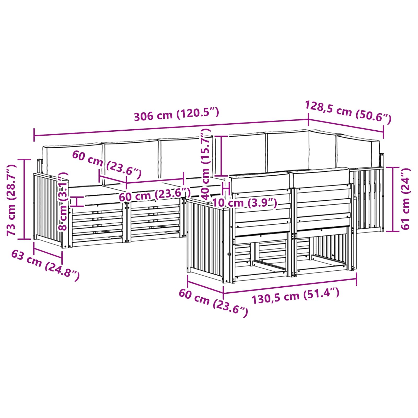 • Celkové rozměry: 306 x 128,5 x 73 cm (D x Š x V)