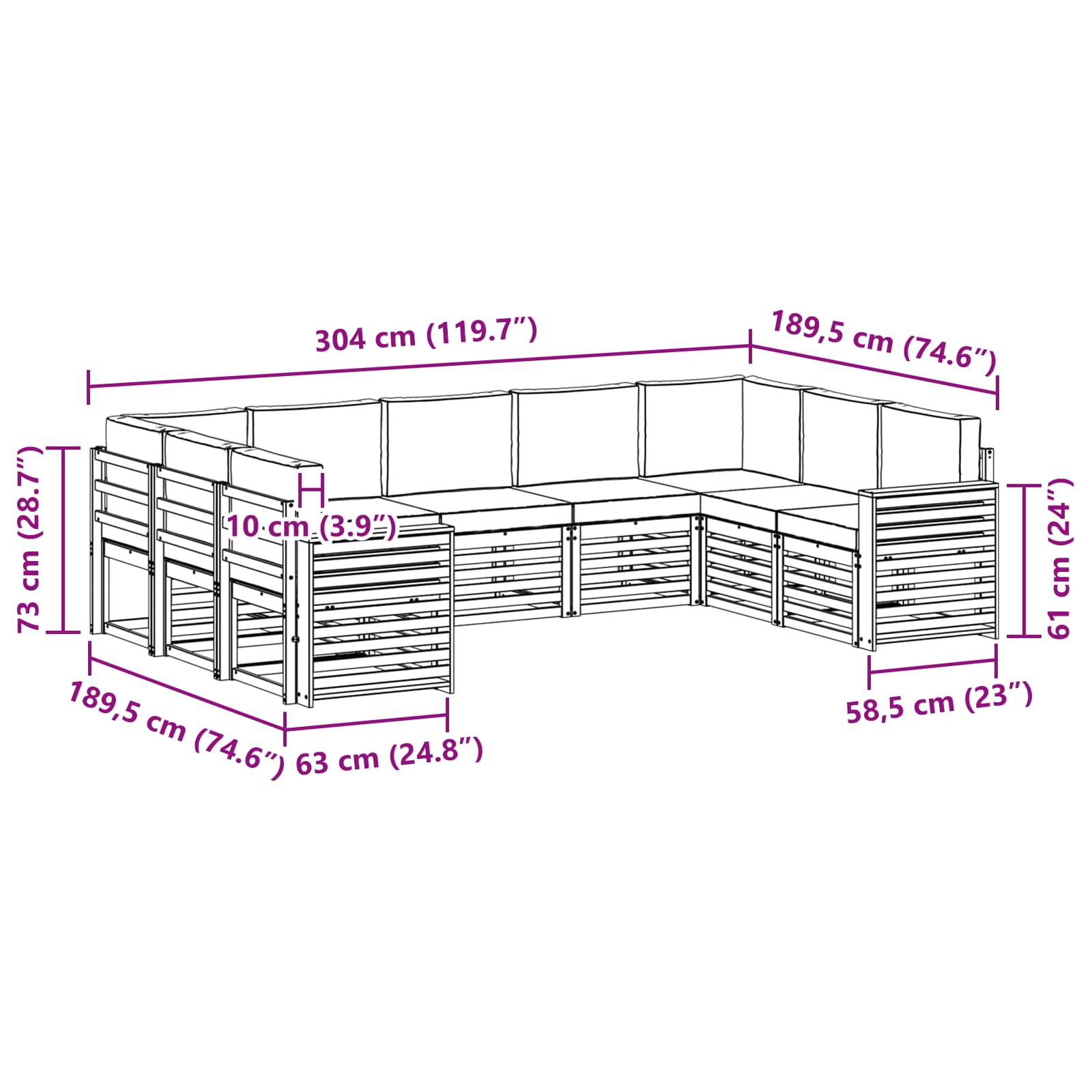 • 7 x Střední pohovka: 63 x 59 x 73 cm (D x Š x V)