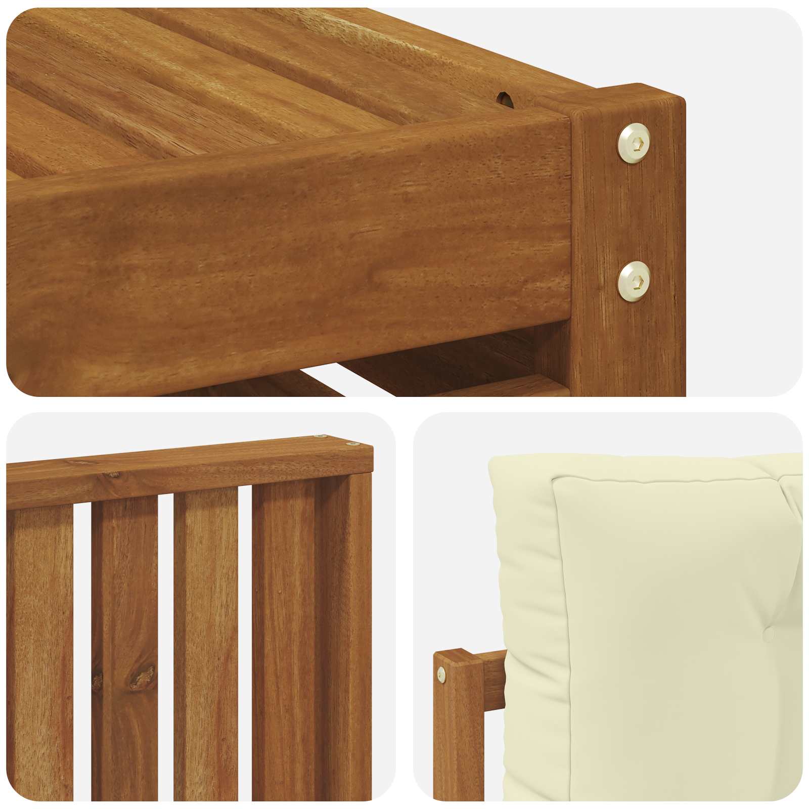• Materiál a konstrukce: Vyrobeno z masivního akáciového dřeva, tahle pohovka nabízí trvanlivost a hezký přírodní povrch, co odolává venkovním podmínkám. Jedinečné dřevo vytváří teplý a příjemný prostor, zatímco přírodní oleje chrání před škůdci pro dlouhou životnost.