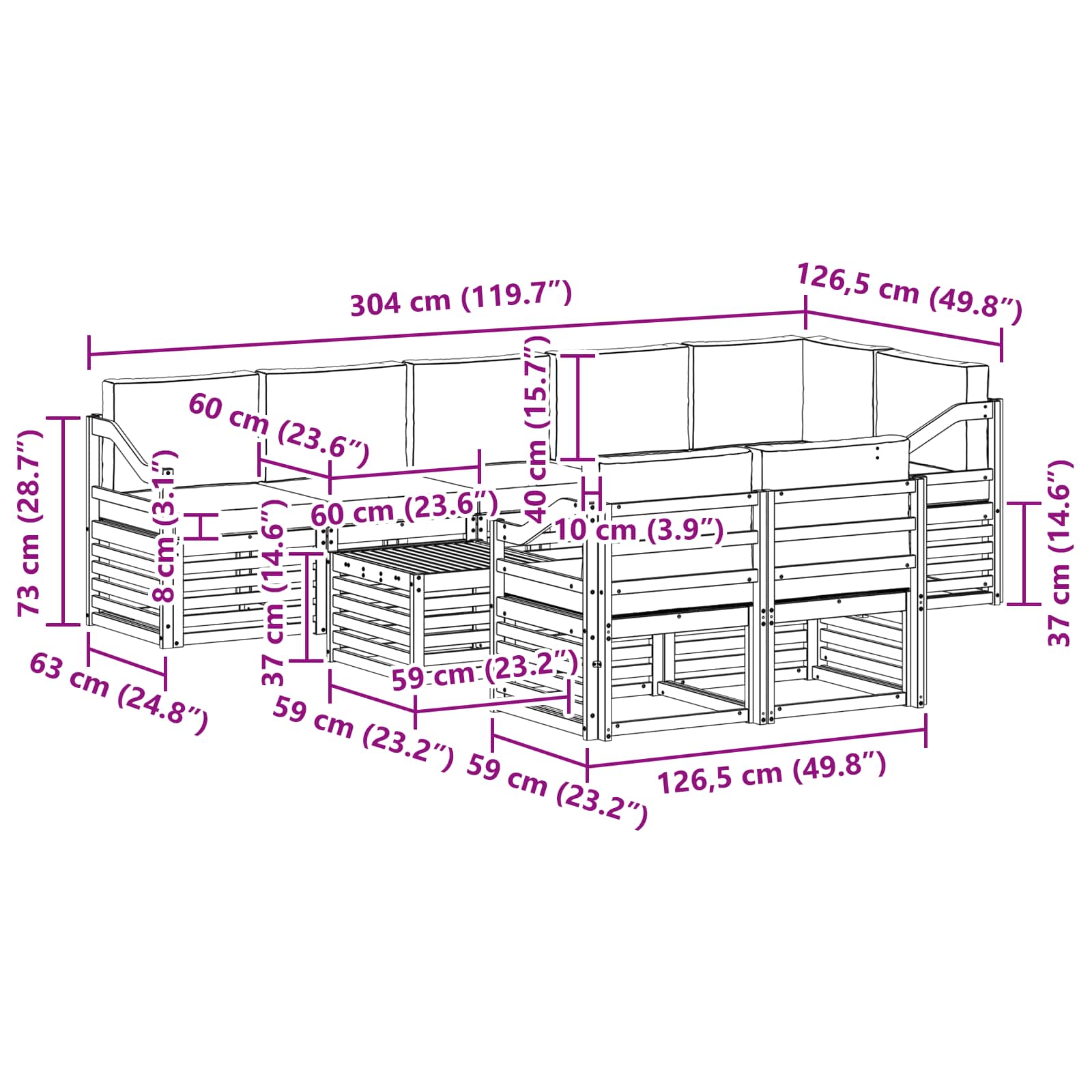 • 7 x Střední sedačka: 63 x 59 x 73 cm (HxŠxV)