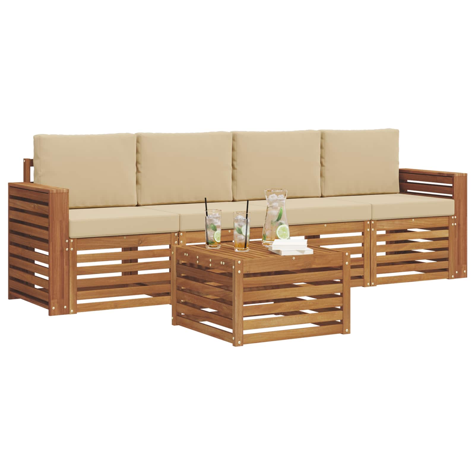 Náš set venkovního nábytku spojuje styl s funkčností a vytváří tak skvělý středobod pro zahrady a terasy. Moderní design s čistými liniemi a minimalistickými detaily přidává nádech elegance a povzbuzuje vás k relaxaci a společenským akcím. Vyrobený z masivního akáciového dřeva, tenhle nábytek je trvanlivý a atraktivní – ideální pro ty, co chtějí skvělé spojení praktičnosti a rafinovaného designu.