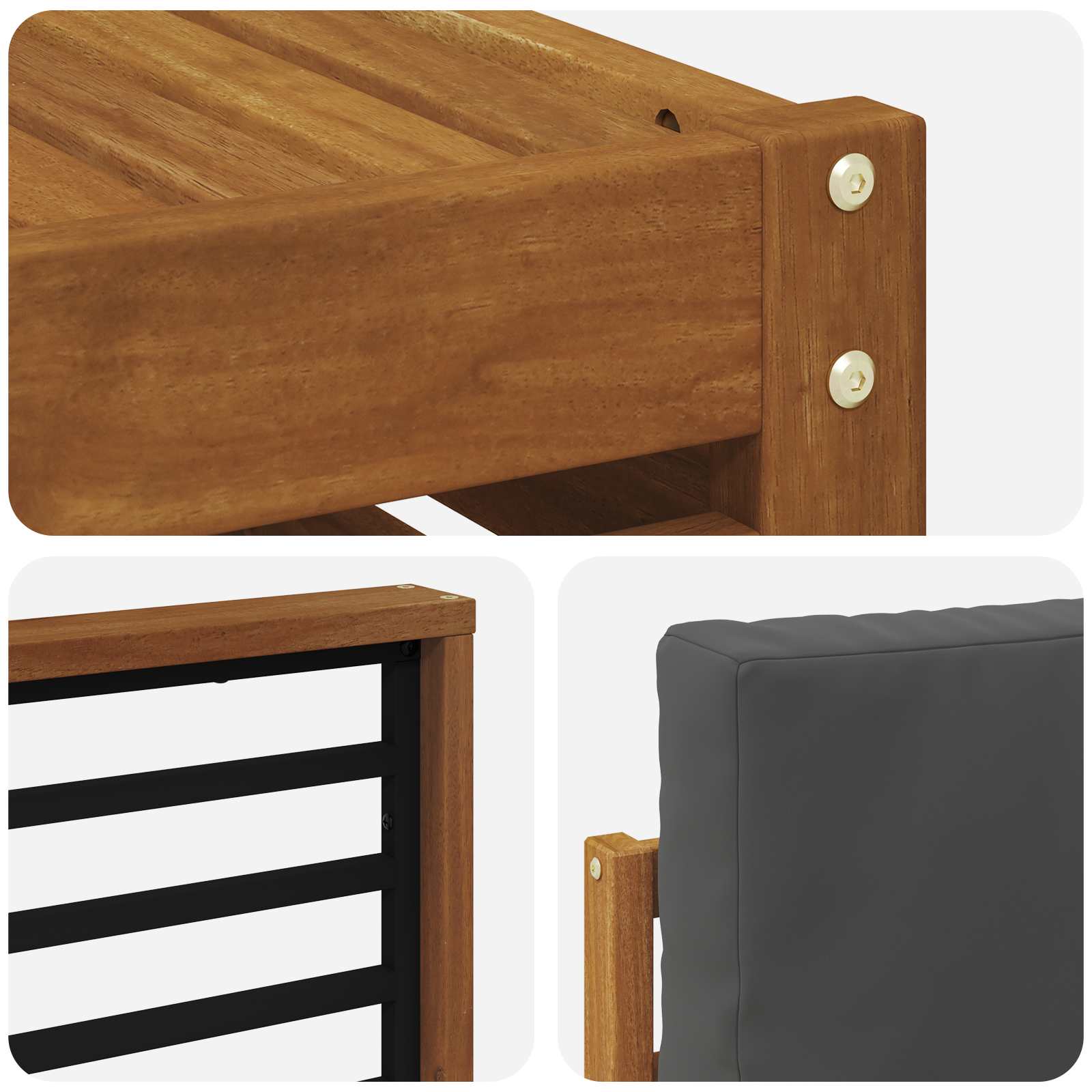 • Odolné masivní akáciové dřevo: Tato venkovní souprava nábytku vydrží a odolá venkovním podmínkám. Je robustní a stabilní, s přirozeným hnědým tónem, který skvěle doplní každou zahradu nebo patio.