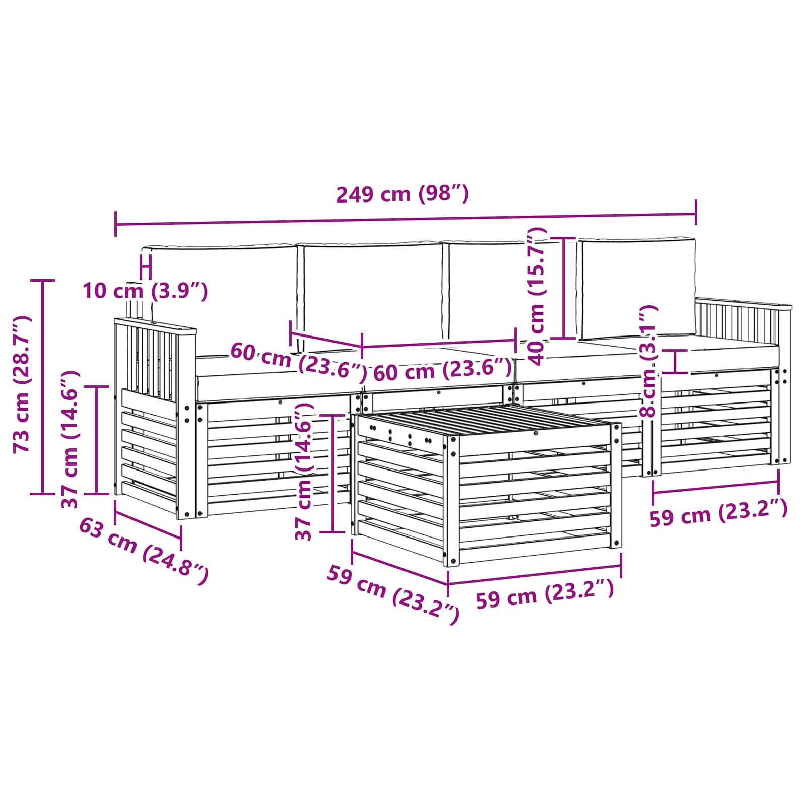 • 4 x Středová pohovka: 63 x 59 x 73 cm (DxŠxV)