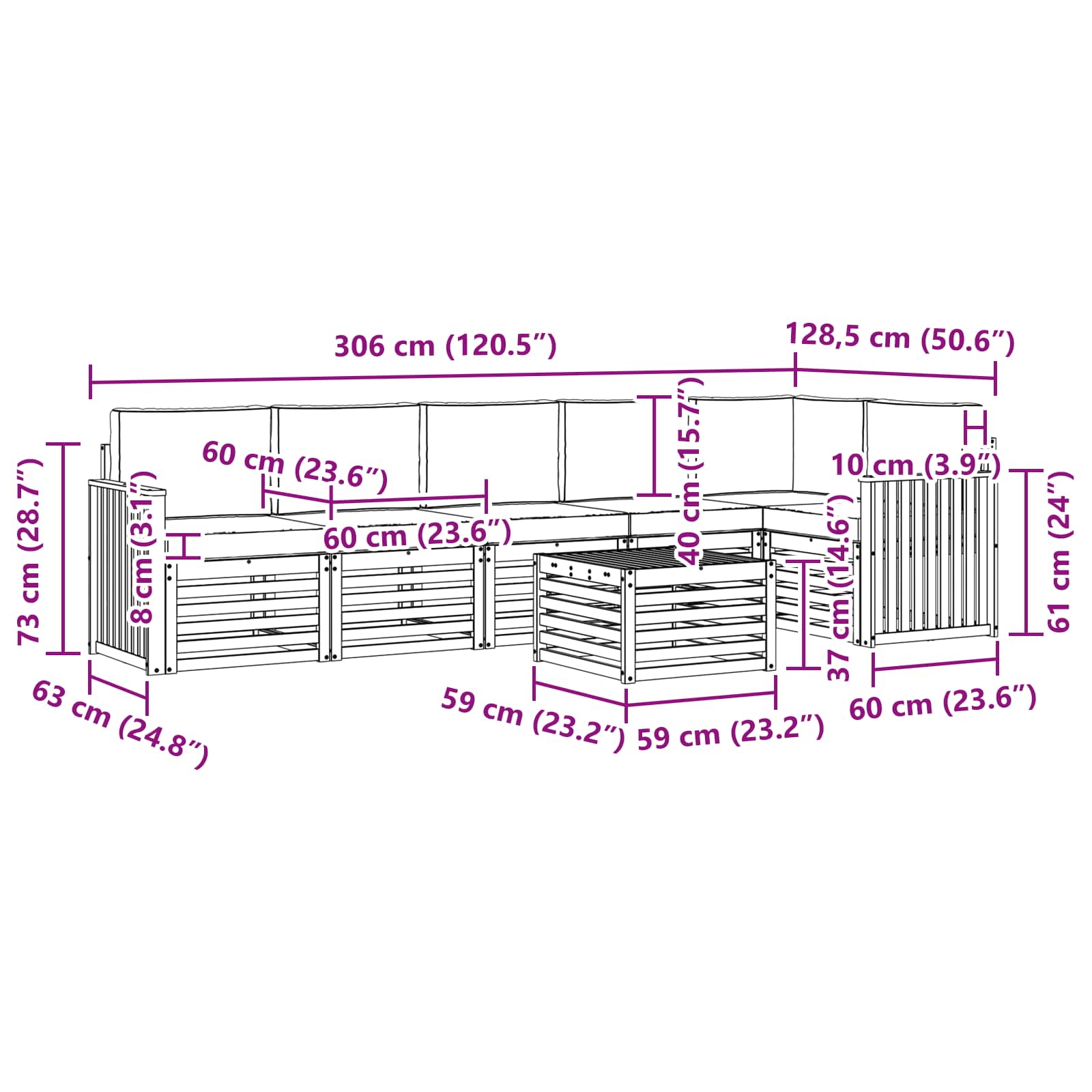 • 5 x Středová pohovka: 63 x 59 x 73 cm (D x Š x V)