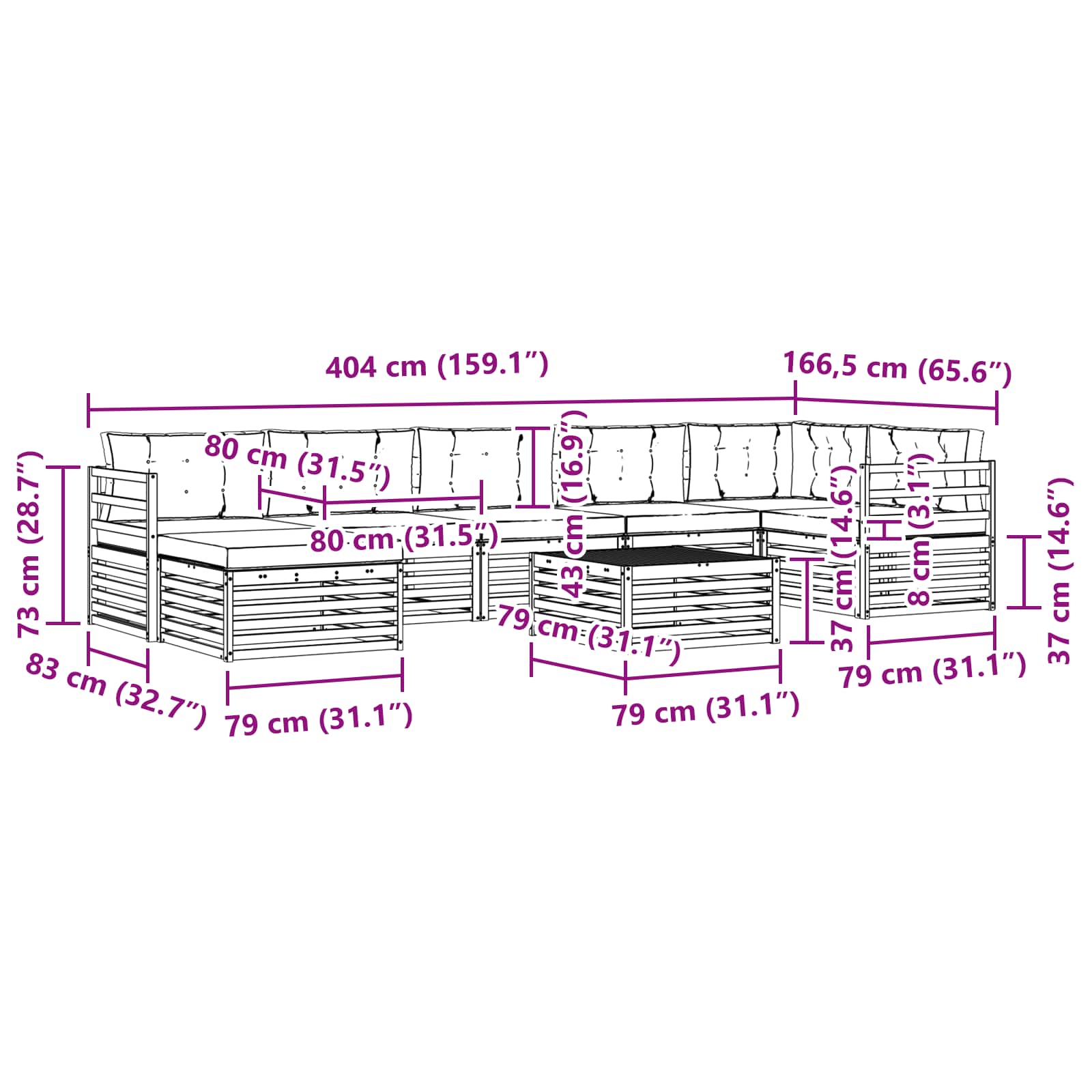 • 7 x Sedací polštář: 80 x 80 x 8 cm (D x Š x V)