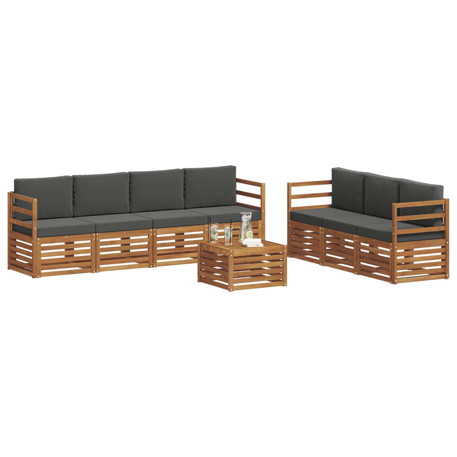 Zahradní nábytek splňuje styl a funkčnost, čímž vytvoří skvělý středobod pro jakoukoli zahradu nebo terasu. Moderní design s čistými liniemi přidává eleganci a podporuje venkovní relaxaci a společenské akce. Vyrobeno z masivního akáciového dřeva, nabízí trvanlivost a dlouhotrvající vizuální přitažlivost, ideální volba pro praktické a atraktivní venkovní nábytek.