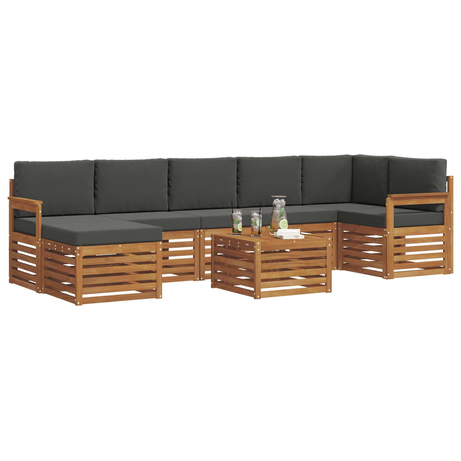 Tato zahradní souprava skvěle spojuje styl a funkčnost, vytváří úžasný středobod pro každou zahradu nebo terasu. Moderní design s čistými liniemi a minimálním zdobením dodává eleganci a podporuje tak venkovní odpočinek a společenské akce. Vyrobena z masivního akáciového dřeva, zajišťuje trvanlivost a dlouhotrvající vzhled, což ji činí ideální pro ty, kdo hledají praktičnost a slušný design venkovního nábytku.
