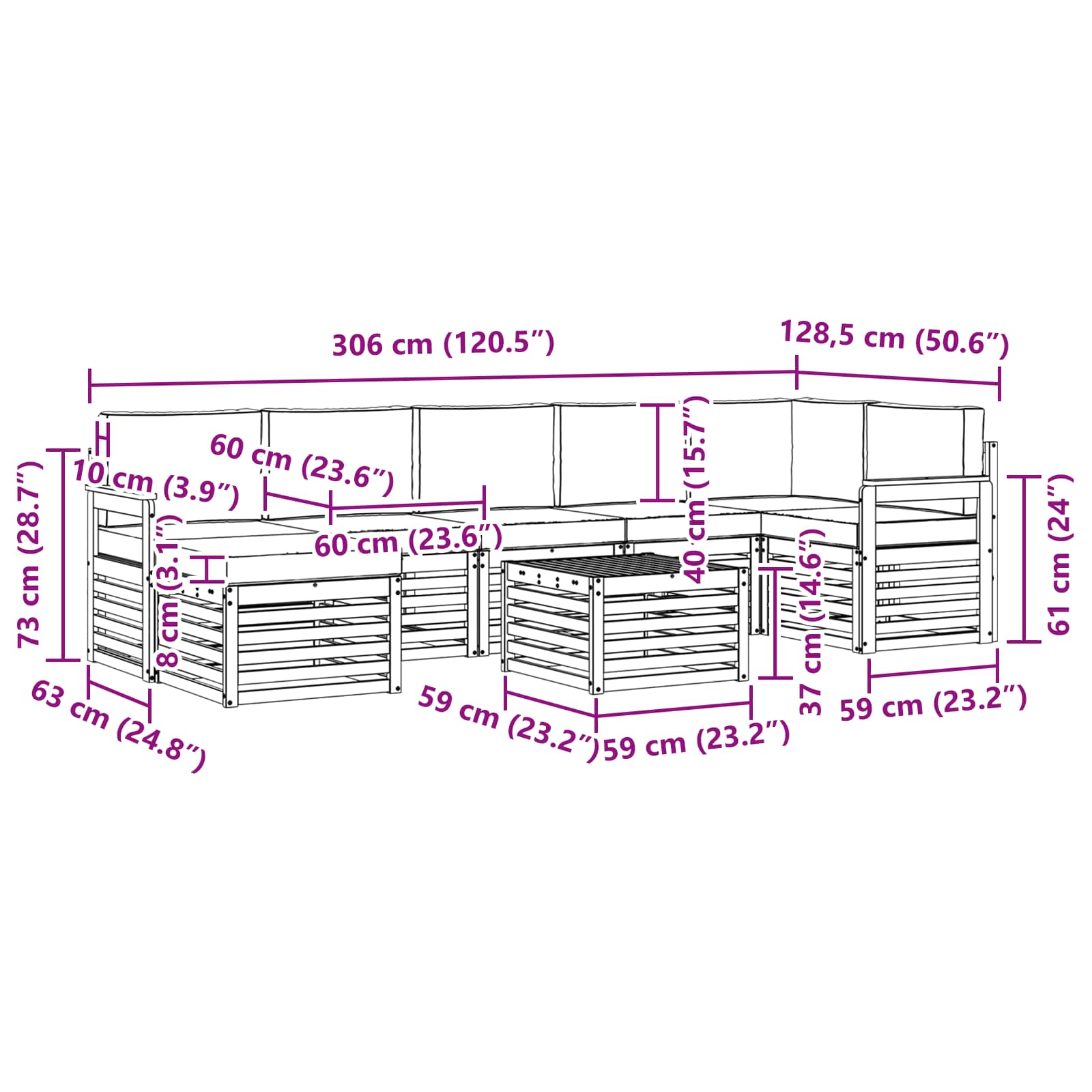 • 5 x Střední pohovka: 63 x 59 x 73 cm (D x Š x V)