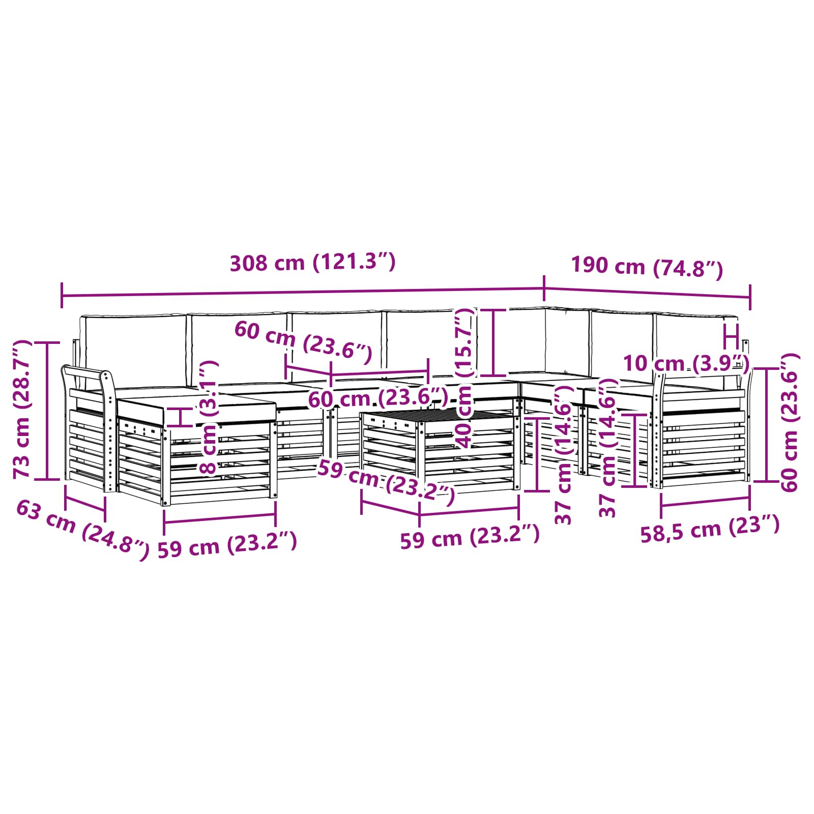 • 6 x Středová pohovka: 63 x 59 x 73 cm (D x Š x V)