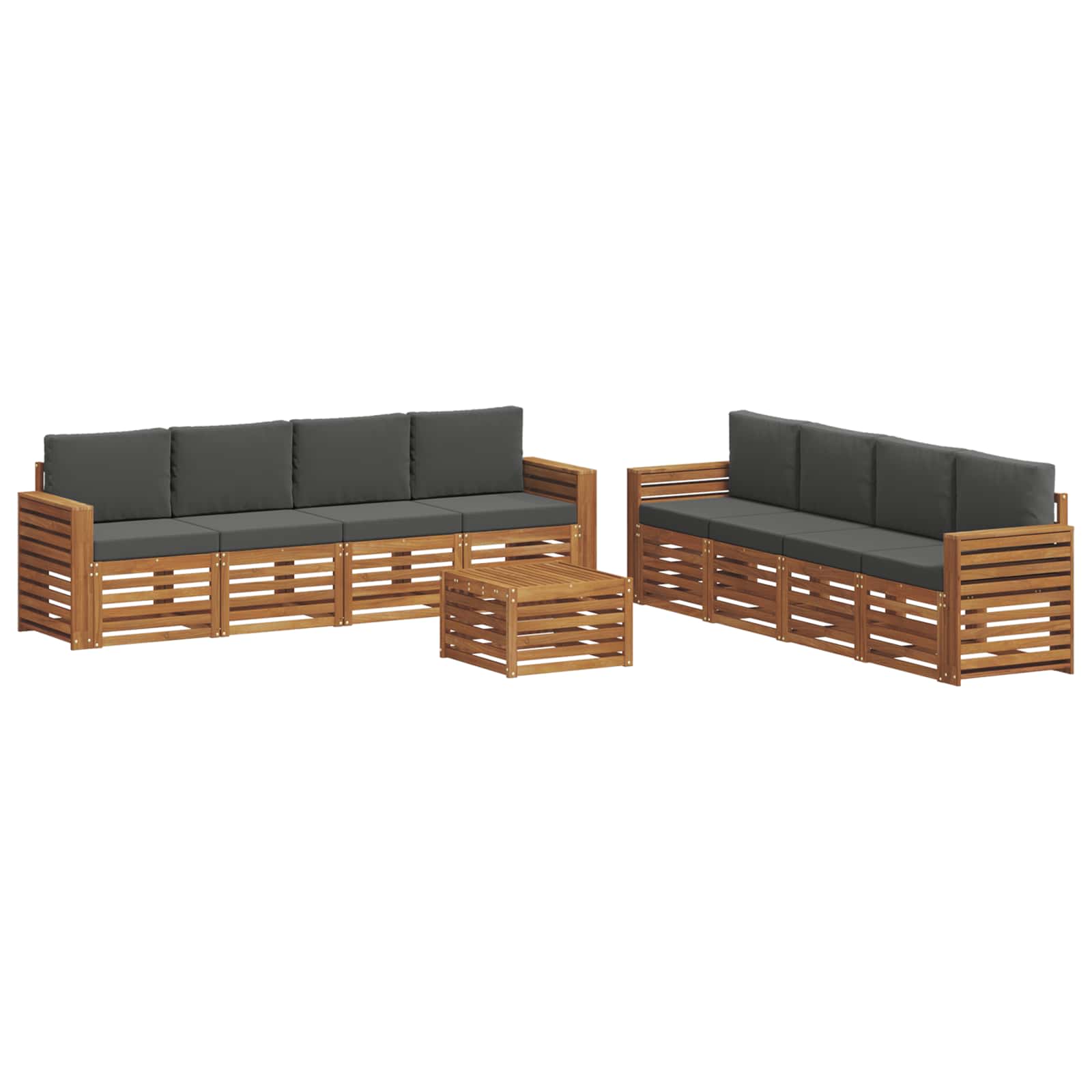 Sada venkovního nábytku skvěle kombinuje styl a funkčnost, a promění tak vaši zahradu nebo terasu v příjemné místo. Její moderní design s čistými линиями přidává eleganci a podporuje pohodlné venkovní chvíle i společenské akce. Celá je z masivního akáciového dřeva, což zaručuje dlouhou životnost a skvělý vzhled, takže je to ideální volba pro ty, kteří hledají praktičnost s trochou elegance.