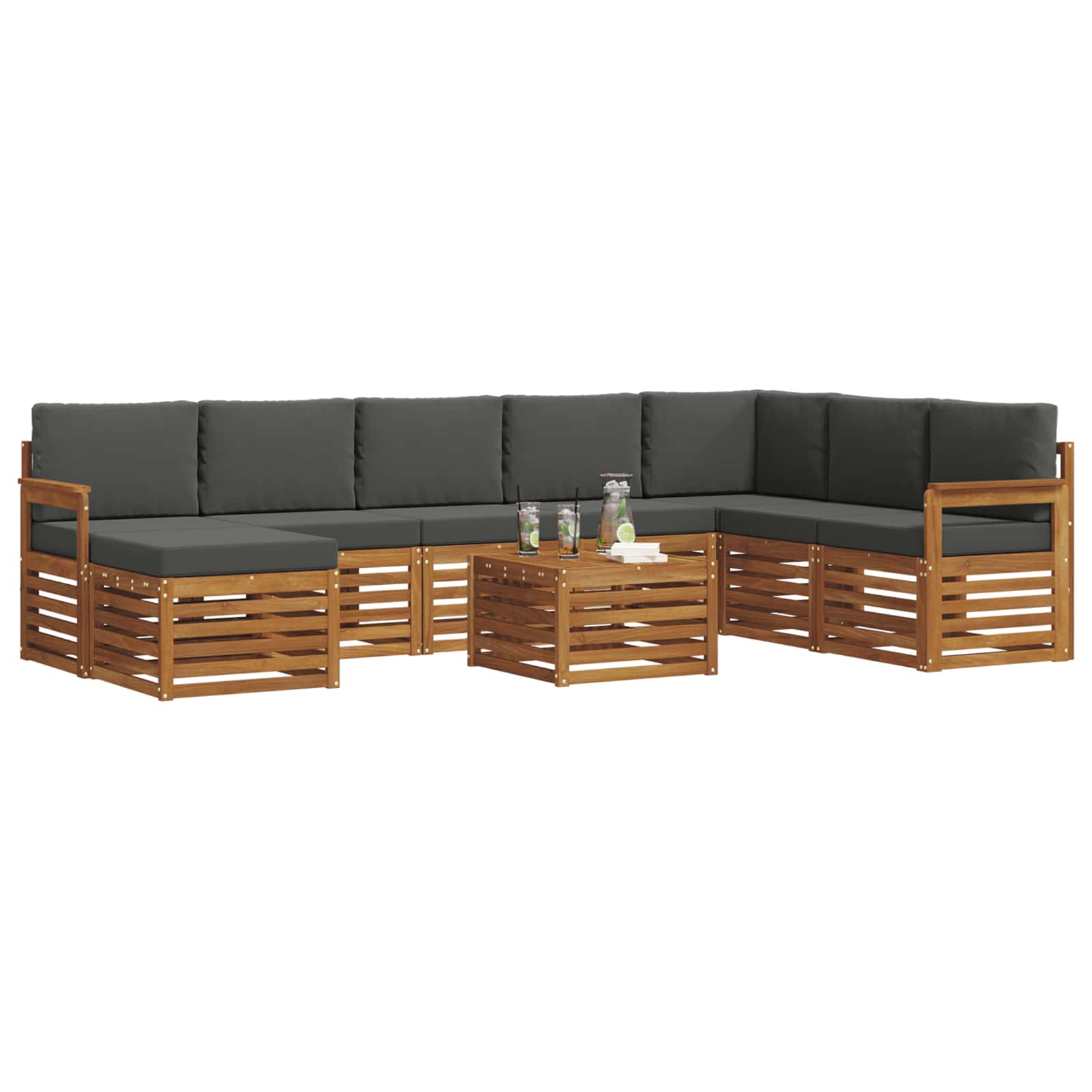 Tato zahradní souprava spojuje styl s funkčností a stává se krásným středem pozornosti na každé zahradě nebo terase. Moderní design s čistými liniemi a minimálním zdobením dodává eleganci a podporuje odpočinek i společenské chvíle na čerstvém vzduchu. Vyrobená z masivního akáciového dřeva, je to trvanlivý a atraktivní nábytek pro ty, kteří hledají praktickou eleganci.
